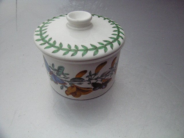 Rzadko spotykany, bo z przykrywką, porcelanowy Pojemnik sygnowany PORTMEIRION Made in England z rysunkami Susan Williams Ellis. Z kultowej serii BOTANIC GARDEN /Dishwasher proof; oven to table; freezer & microwave safe/. W pełni użytkowy i przepięknie zdobiony. Mocny,szlachetny. Na cieplej bieli porcelany botaniczna rycina i charakterystyczne motyle i ćmy... w przyjemnych dla oka żywych barwach. Całość na błyszcząco szkliwiona. Średnica 8,5; wysokość ponad 7 cm. Stan zachowania bardzo dobry.