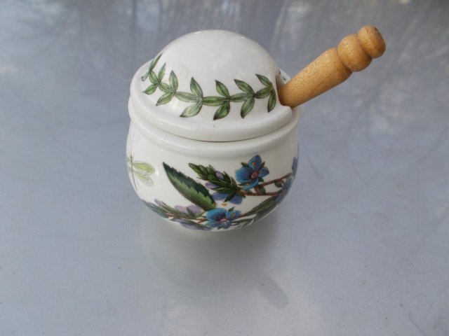 Rzadko spotykany, bo z przykrywką, porcelanowy Pojemnik sygnowany PORTMEIRION Made in England z rysunkami Susan Williams Ellis. Z kultowej serii BOTANIC GARDEN /Dishwasher proof; oven to table; freezer & microwave safe/. W pełni użytkowy i przepięknie zdobiony. Mocny,szlachetny. Na cieplej bieli porcelany botaniczna rycina i charakterystyczne motyle i ćmy... w przyjemnych dla oka żywych barwach. Całość na błyszcząco szkliwiona. Z drewnianą łyżeczką w komplecie. Przykrywka z dziurką i rantem mocującym. Serię tę poleca w swoich programach kulinarnych p. Makłowicz :)
