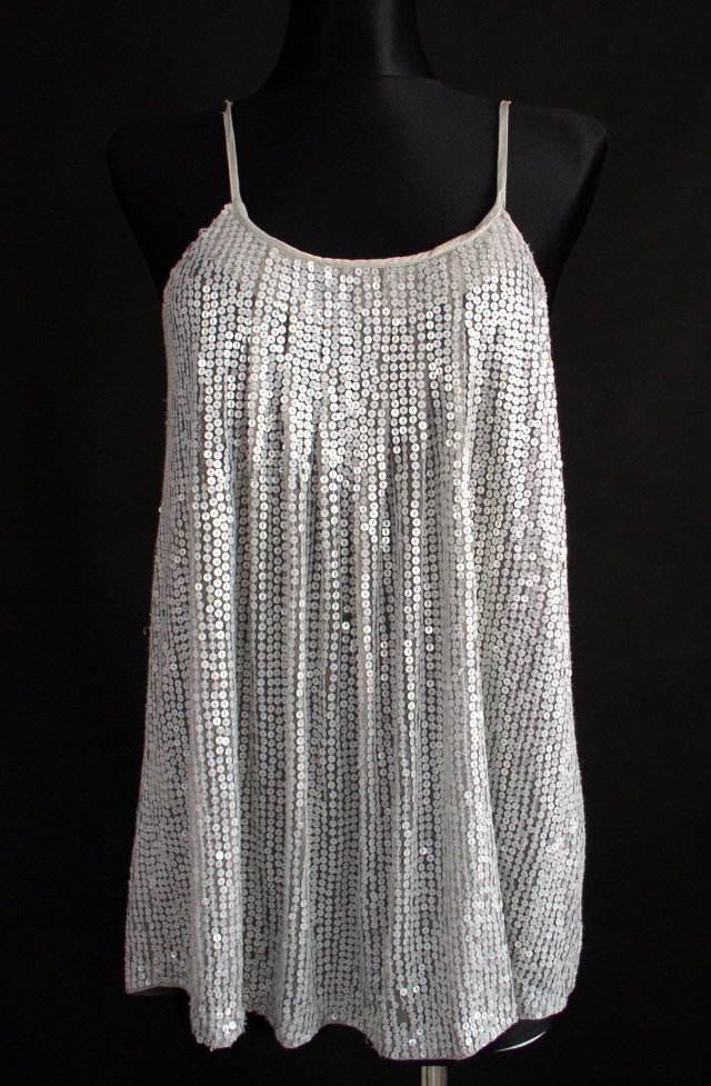 Wizytowa bluzka firmy BOTTOMS.Rozmiar 38.Materiał polyester,szara siateczka z naszytymi srebrnymi cekinami.Ramiączka regulowane.Przy dekolcie zaszyte zakładki.Stan ogólny dobry,małe braki w cekinach.Długość boku 47 cm.pod pachami 96 cm.