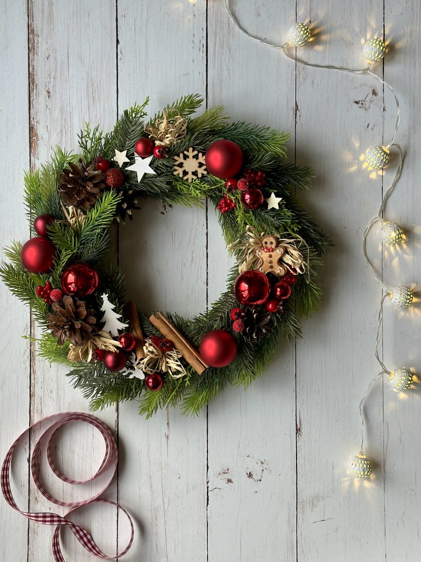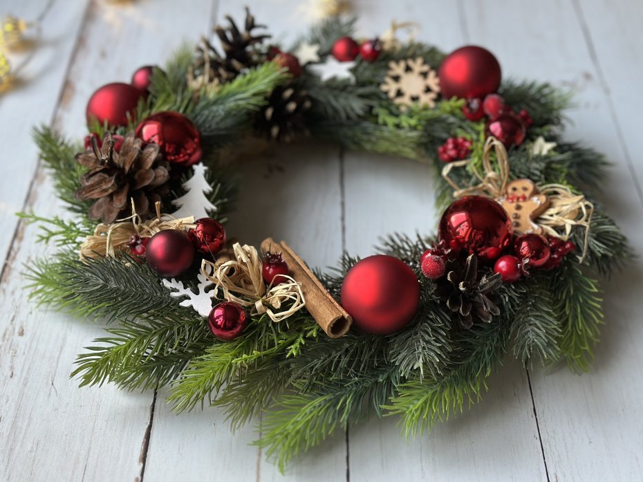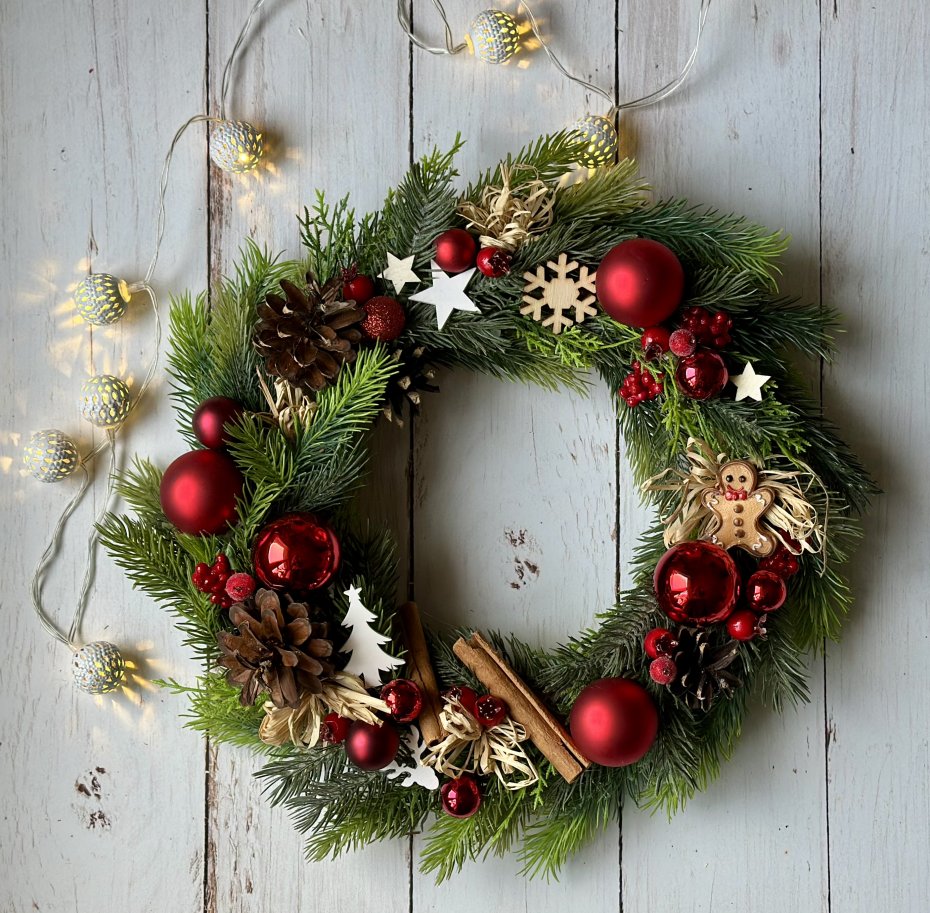 Wykonany z wielką dbałością o szczegóły wianek bożonarodzeniowy. Zimowa dekoracja świąteczna z ozdobami ze sztucznego igliwia i dodatków (szklane bombki, naturalne i syntetyczne ozdoby).