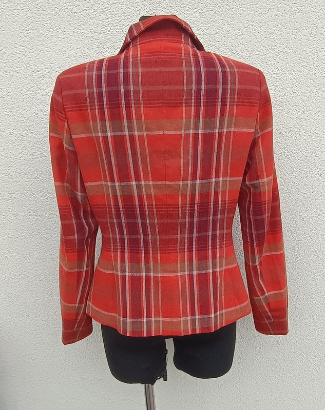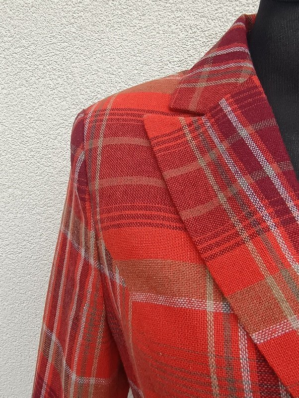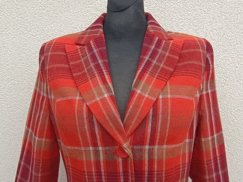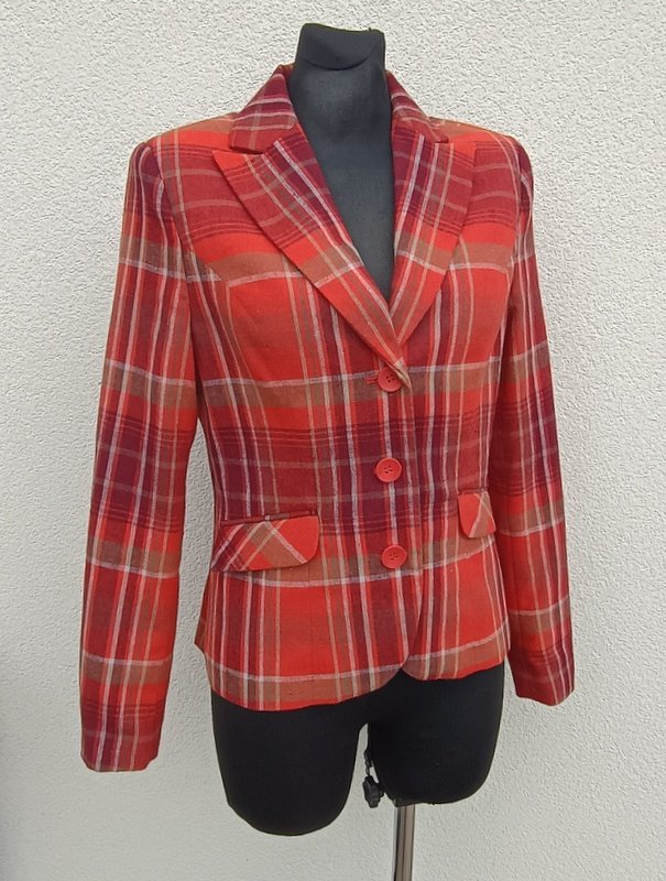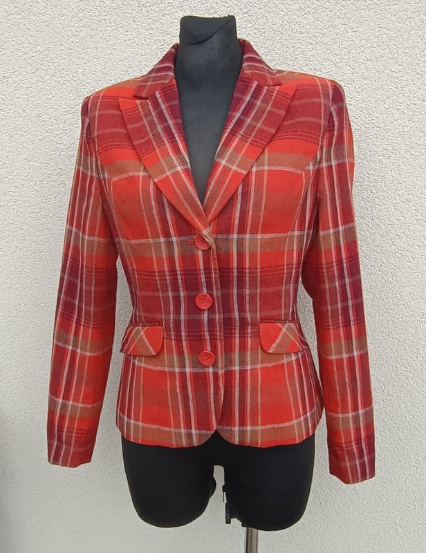 Marynarka w kratkę w kolorach rudości, burgundu, zgniłej zieleni i złamanej bieli . Taliowana, z kołnierzem z rewersami, z dwiema wpuszczanymi kieszeniami z patkami. Zapinana na trzy guziki. Całość na podszewce