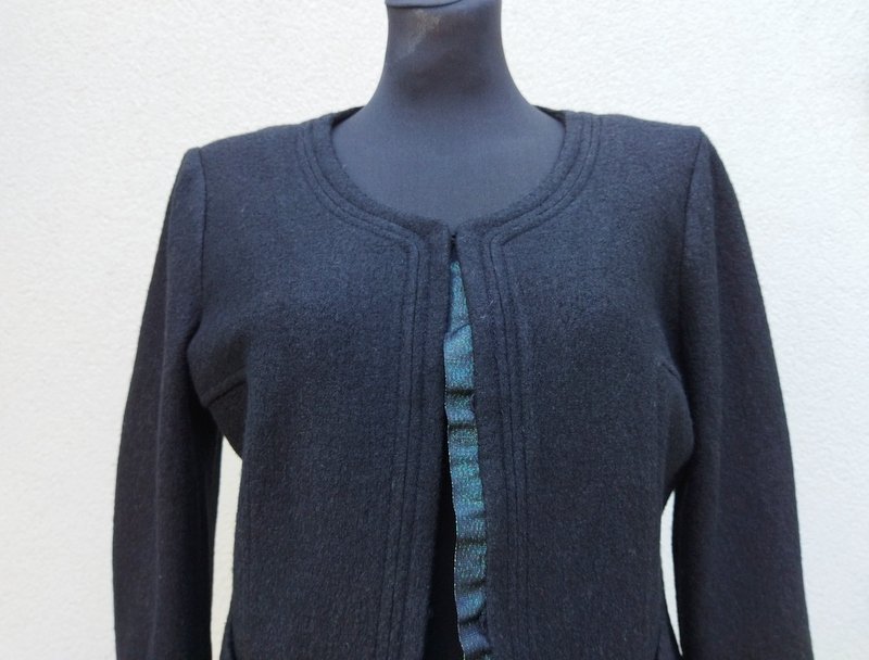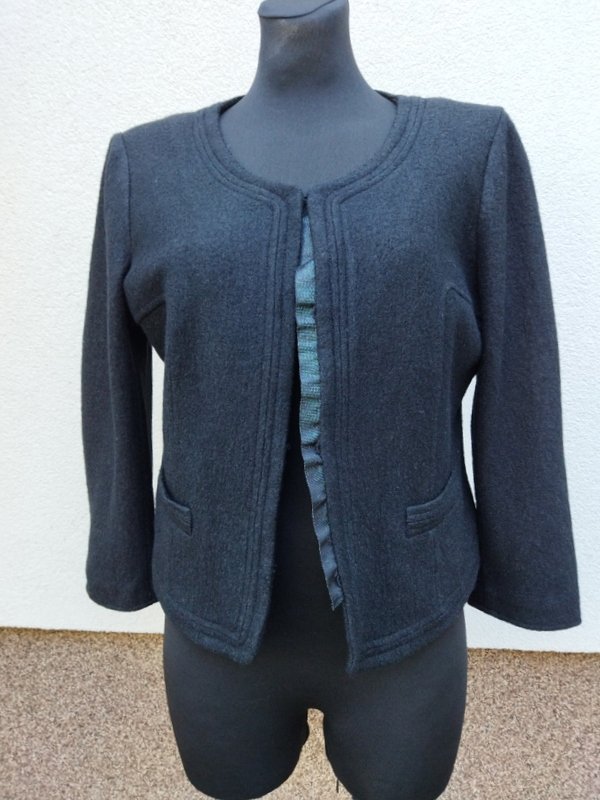 Krótka marynarka z wiskozowo-wełnianej tkaniny w czarnym kolorze. Taliowana, bez kołnierza, z dwiema wpuszczanymi kieszeniami. zapinana od wewnątrz na oblekane haftki. Na podszewce