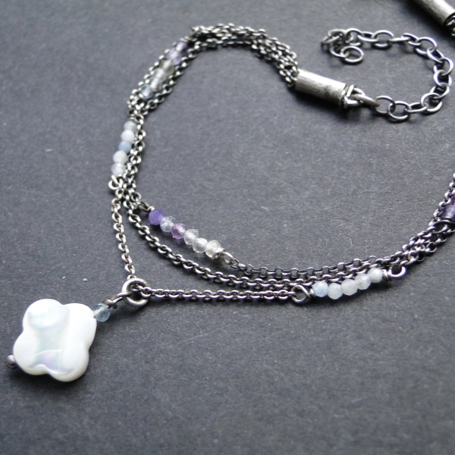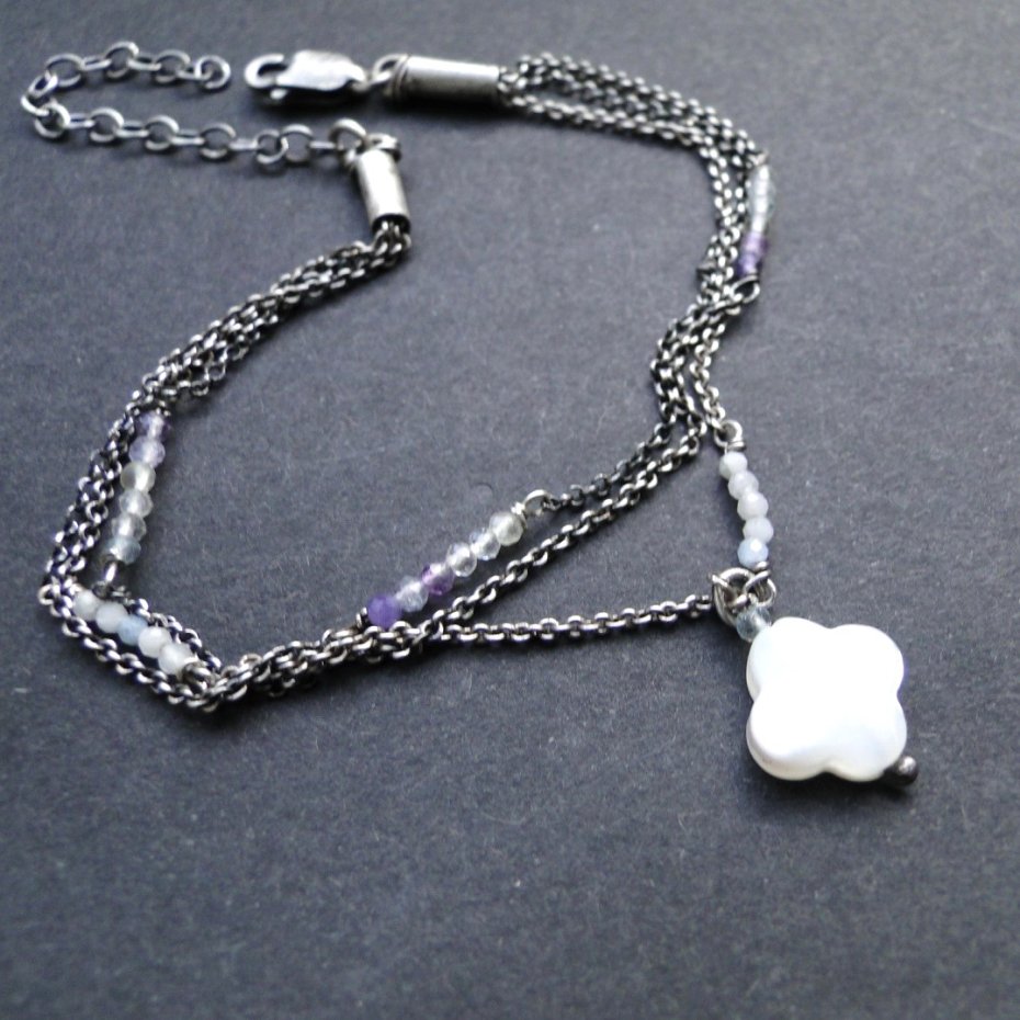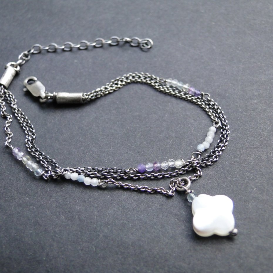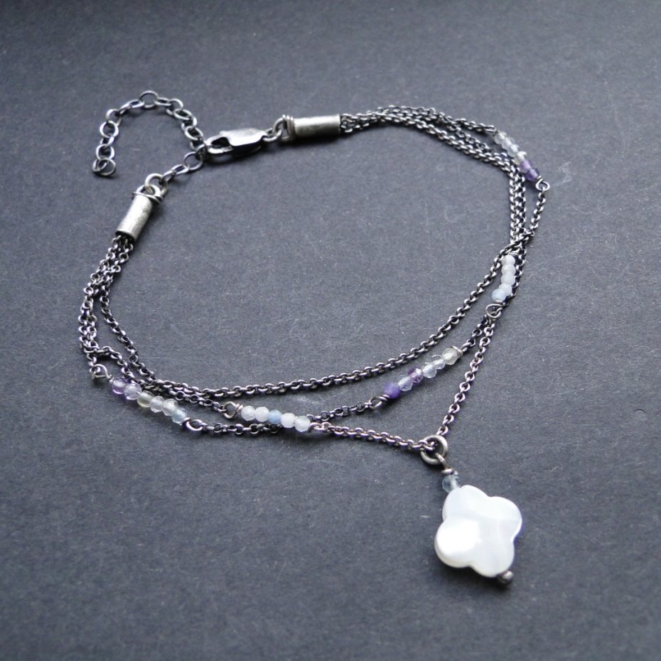 Delikatna,pastelowa bransoleta. Srebro 925,oksydowane i szorowane.Kamienie: naturalny fluoryt oraz akwamaryn w pastelach,śr.2mm,fasetowane. Zawieszka z masy perłowej z poświatą z odcieniem fioletu,jak fluoryty. Bransoleta pasuje na rękę 16-17 cm .Ma Przedłużke 4 cm. Polecam zestaw z nausznicą do kompletu (jedyny egzemplarz).