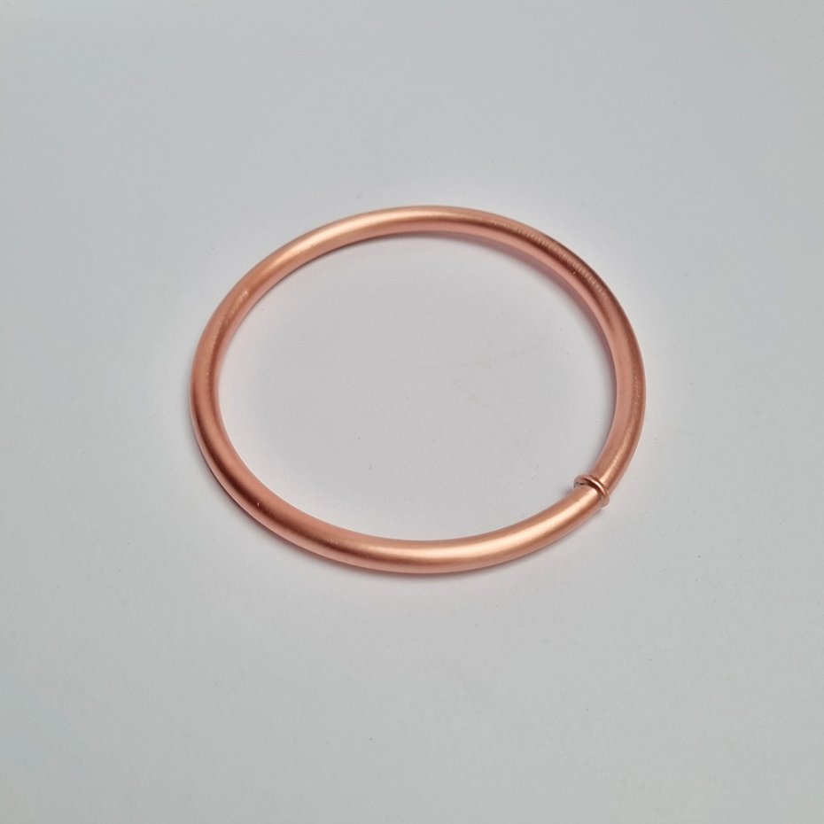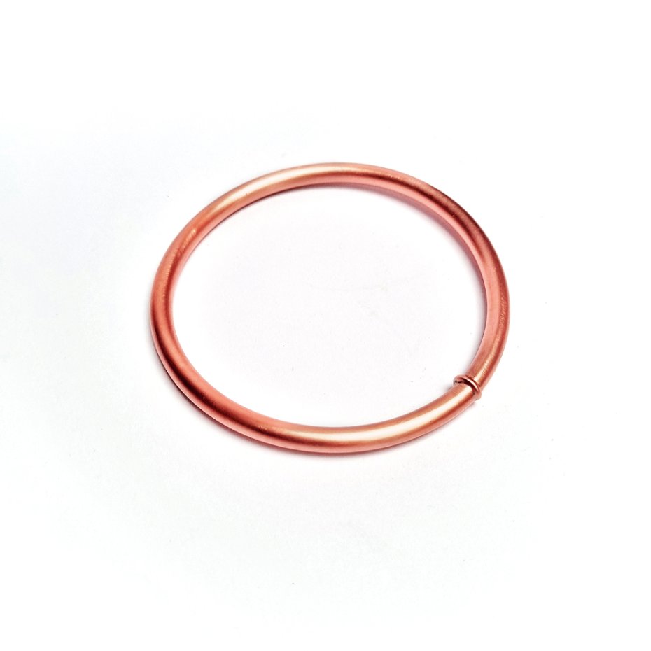 Bransoleta wykonana z rurki miedzianej fi 5mm oraz kryształami górskimi wewnątrz (kulki ok 2mm). Zlutowana lutem z czystej cyny i srebra z drutem miedzianym w środku lutowania oraz ogniwkiem miedzianym. Kształtowana ręcznie i ręcznie przecierana na półmat.