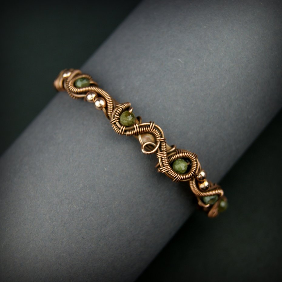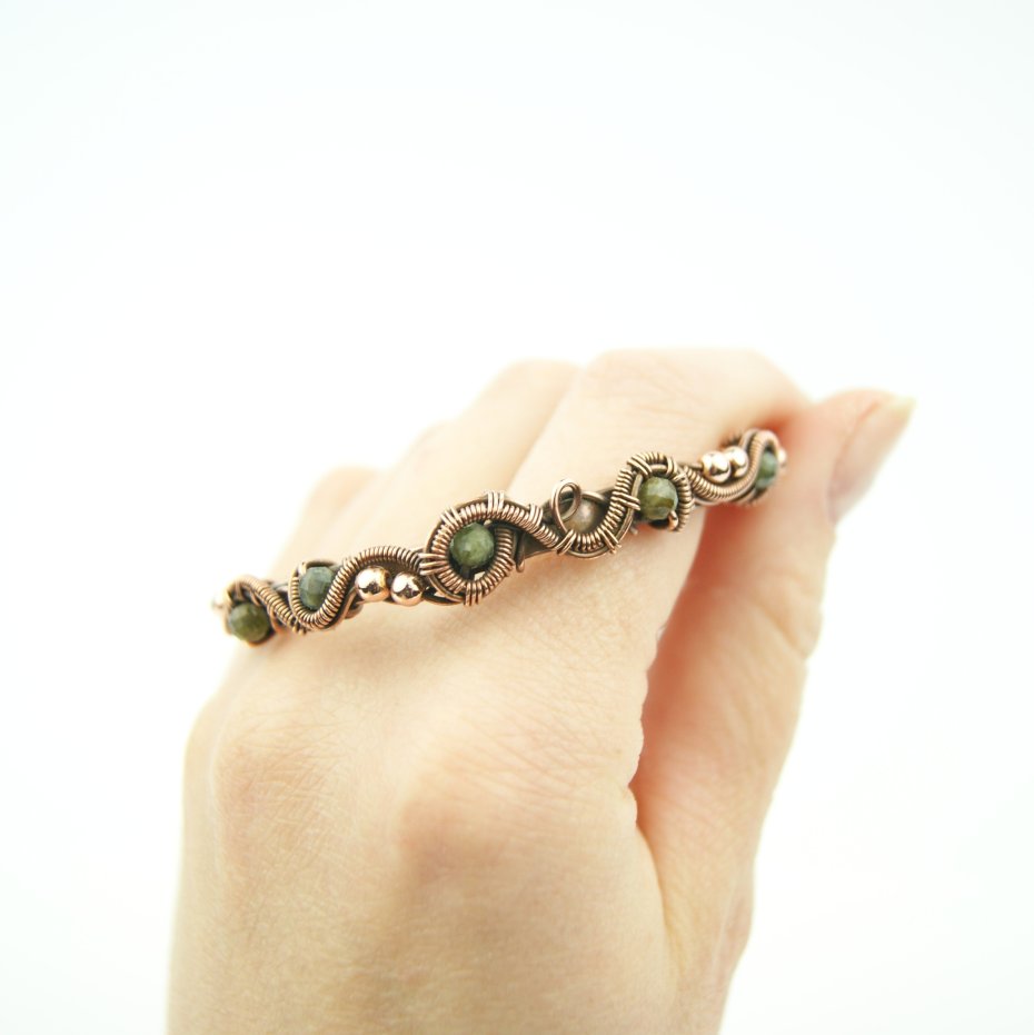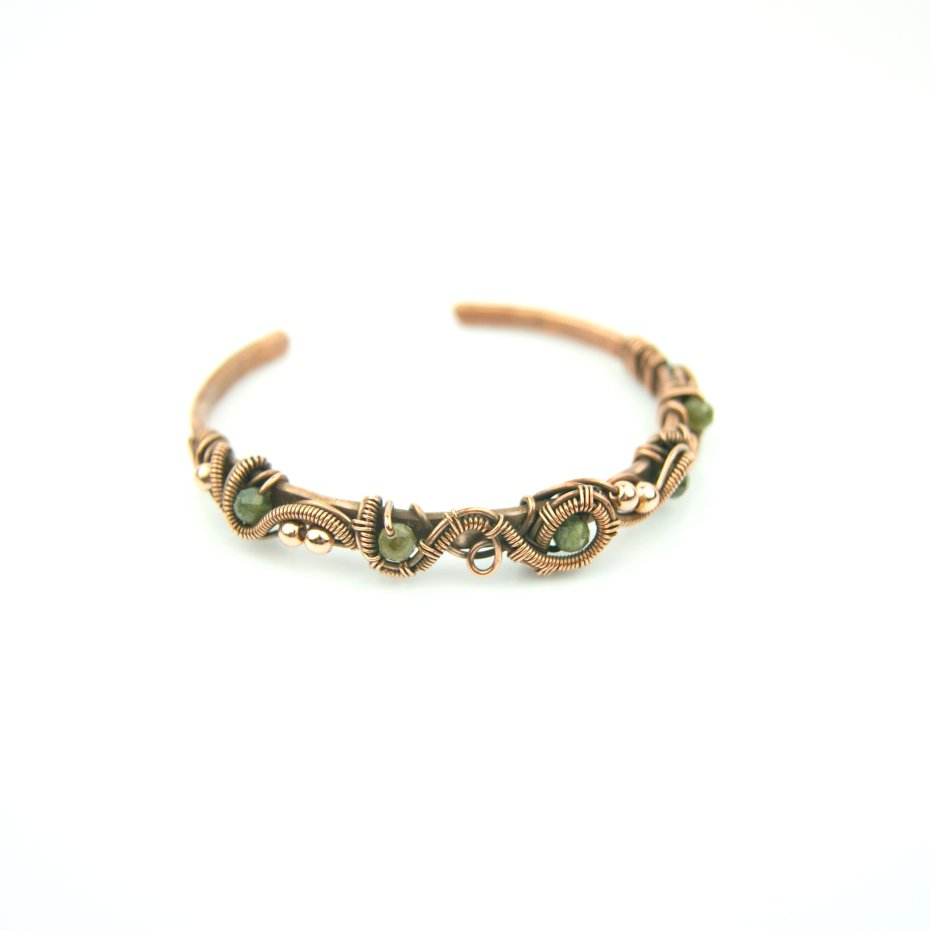 Bransoleta typu cuff (mankietowa) wykonana z fakturowanej miedzi, z misternym oplotem, w którym połyskują kamienie: zielony turmalin oraz hematyt. Średnica bransolety wynosi 5,5 cm, obwód 16,5 cm.