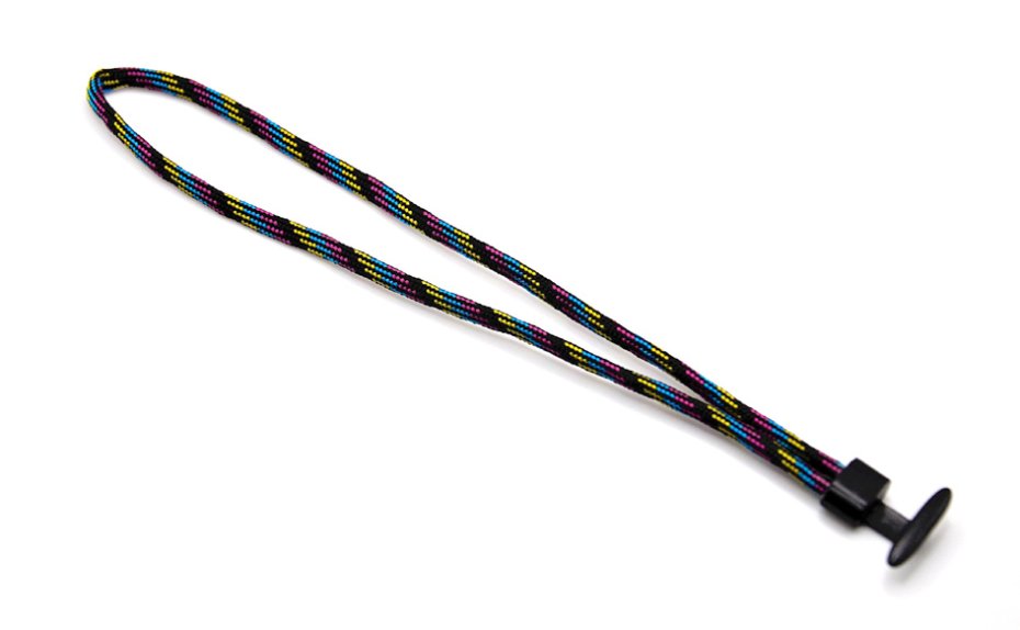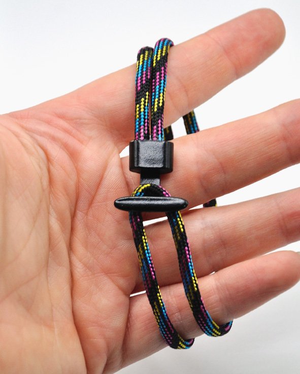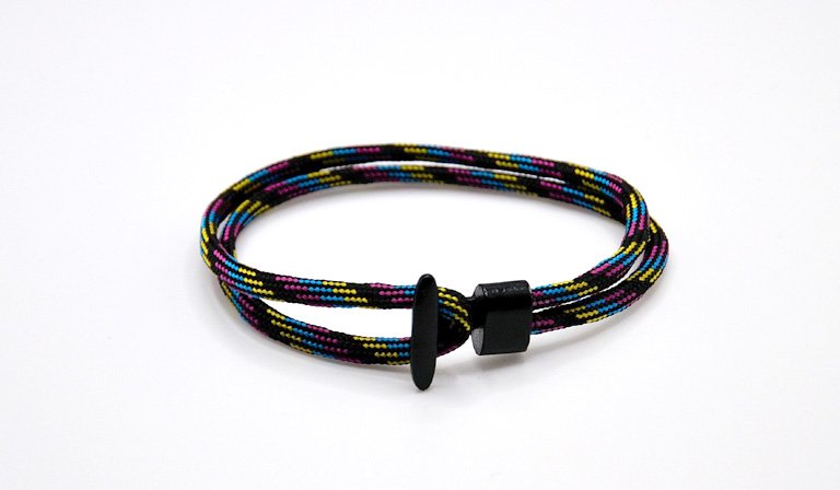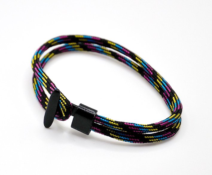 Bransoletka wykonana z grubszego, czarnego sznurka w delikatny niebieski, różowy i żółty wzorek. Zapinana na czarny, metalowy "haczyk".