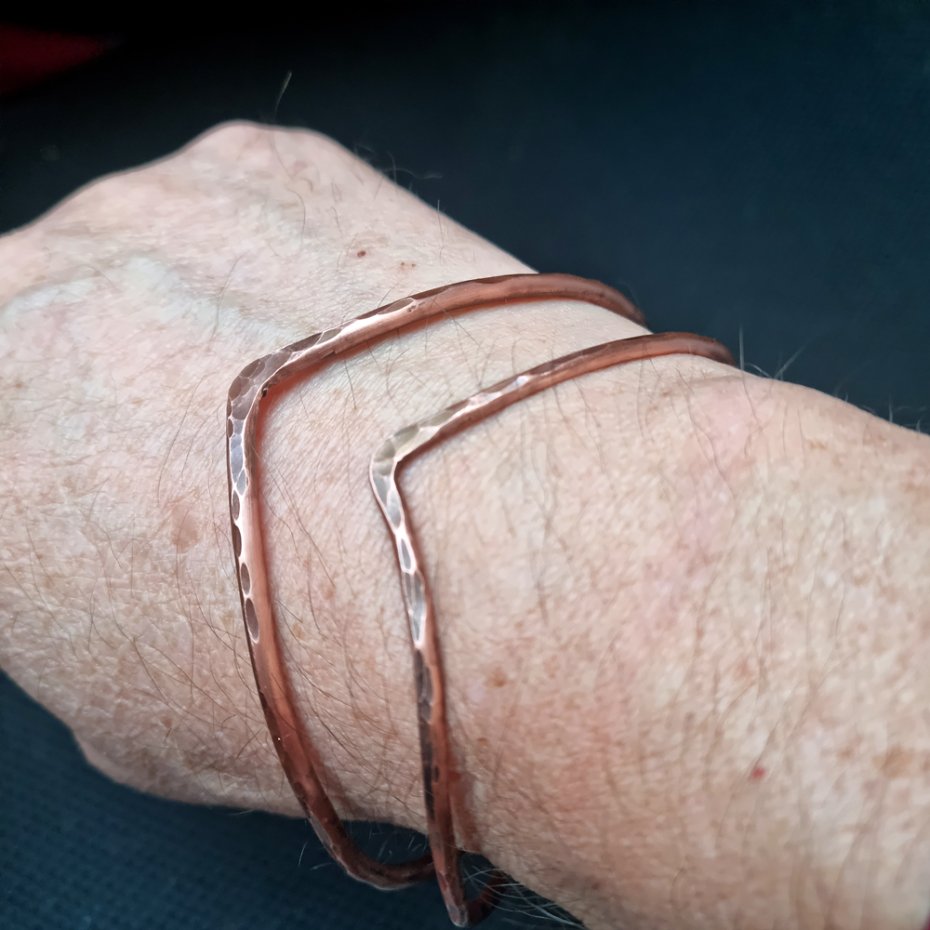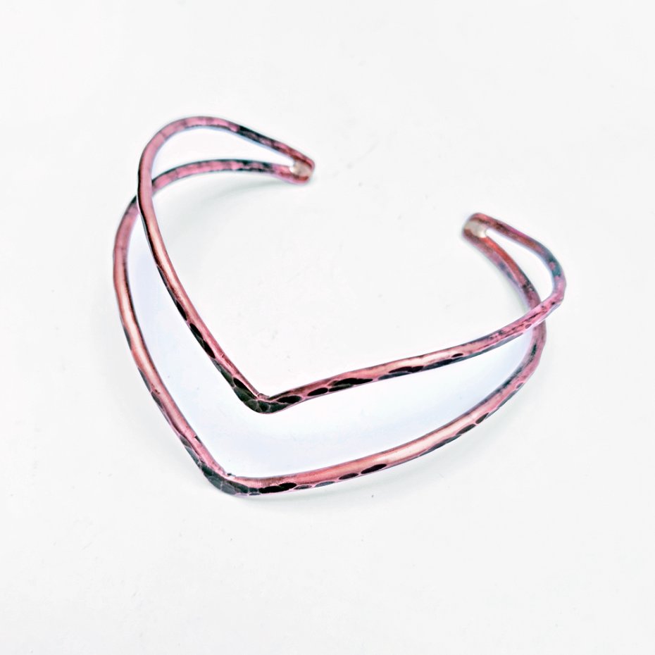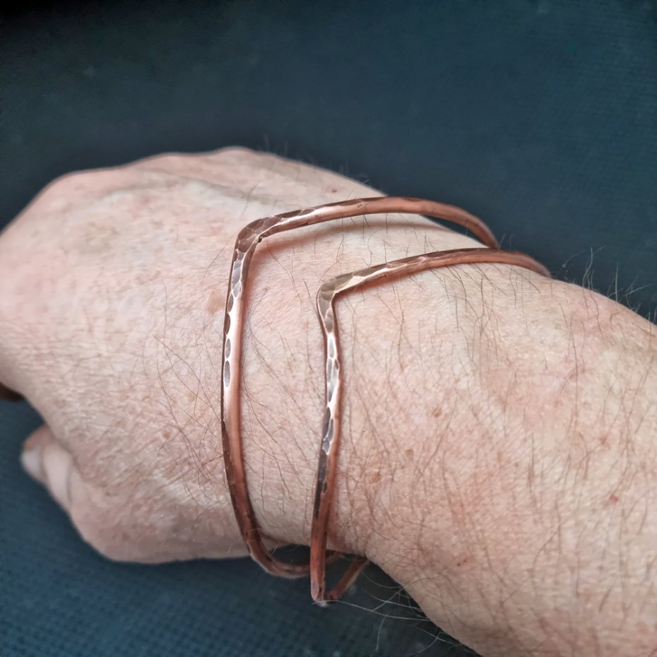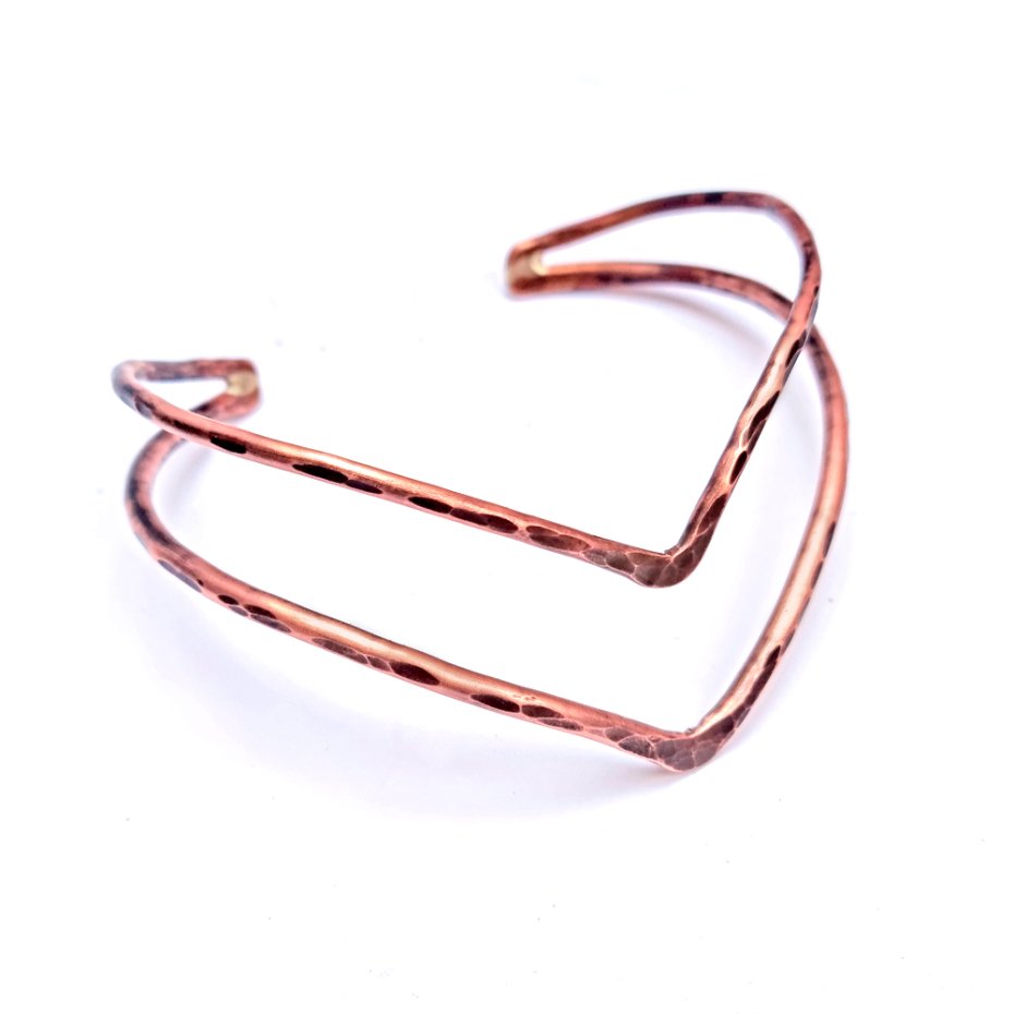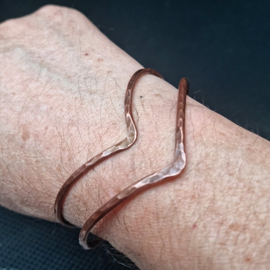 Bransoleta wykonana z czystej, polskiej miedzi, z drutu fi 3mm i fi 2,5mm. Elementy zlutowane twardym lutem srebrnym odpowiednio kształtowane i ręcznie kute, ręczne przecieranie naturalna oksyda ogniowa. Każdy egzemplarz będzie nieco inny, widoczne jest lutowanie. Pięknie prezentuje się spuszczona na samą dłoń, jak również zakładana wysoko: na ramię lub przedramię.