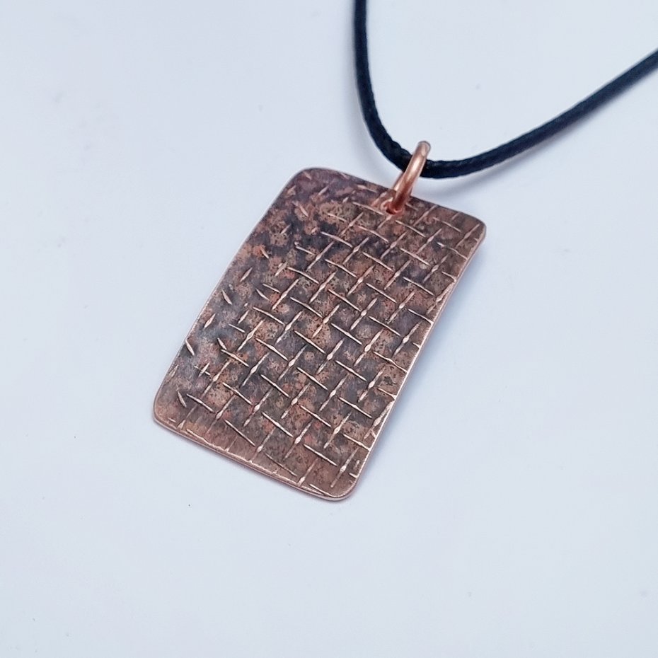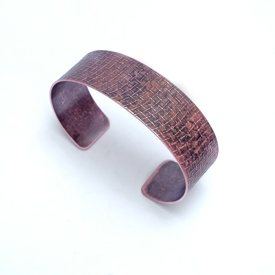 Bransoleta wykonana z czystej, polskiej miedzi, z blachy #1mm. Blacha walcowana razem z odpowiednio wcześniej przygotowaną matrycą. Naturalna oksyda ogniowa, ręczne przecieranie