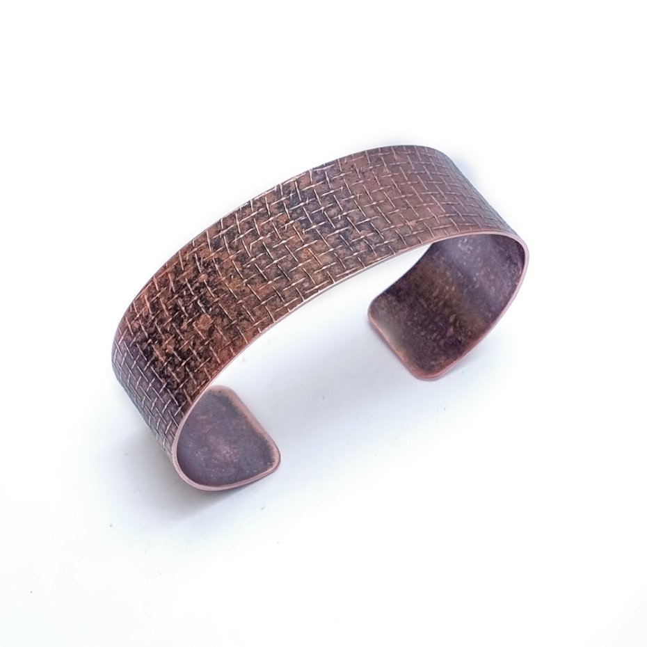 Bransoleta wykonana z czystej, polskiej miedzi, z blachy #1mm. Blacha walcowana razem z odpowiednio wcześniej przygotowaną matrycą. Naturalna oksyda ogniowa, ręczne przecieranie