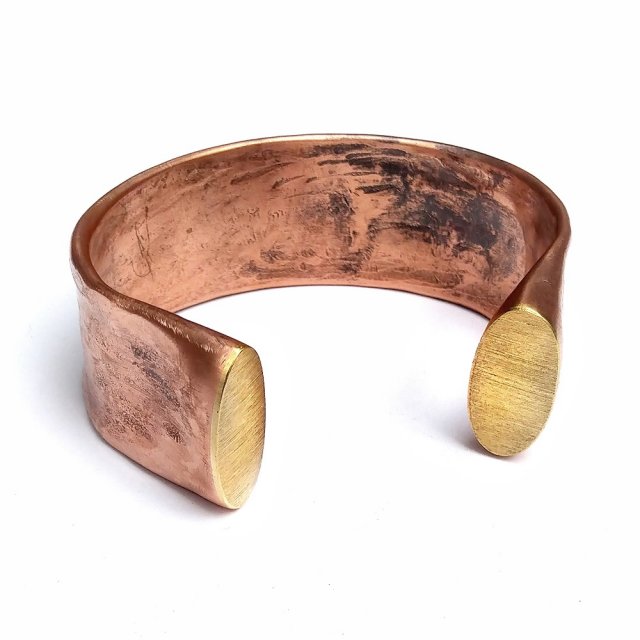 Bransoleta wykonana z miedzi z elementami z mosiądzu, lutowanymi do miedzi twardym lutem srebrnym. Kuta, kształtowana. Pozostawiona naturalna oksyda ogniowa, przecierana ręcznie. Elementy z mosiądzu fakturowane papierem ściernym.