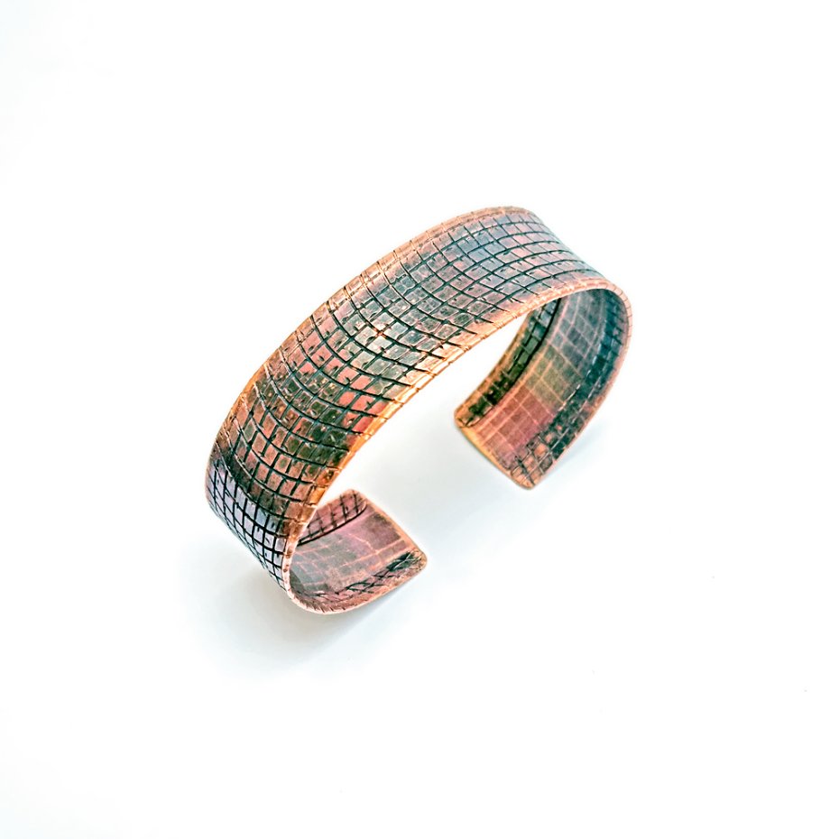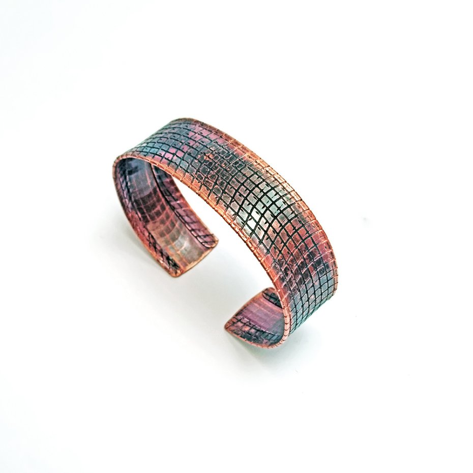 Bransoleta wykona z czystej, polskiej miedzi z blachy 0,6mm. Po przewalcowaniu blachy z matrycą, blacha została ponownie wyżarzona i zagięta z obu długości. Kuta i ręcznie przecierana. Naturalna oksyda ogniowa, jedyny egzemplarz! Mogę zmniejszyć do 16cm (na nadgarstki 15cm;)
