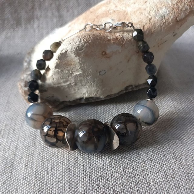 Okazała bransoletka z efektownych egzemplarzy agatu wężowego i fasetowanych korali ocean stone. Wszystkie elementy metalowe: przekładki, zapięcie, łańcuszek - srebro 925.