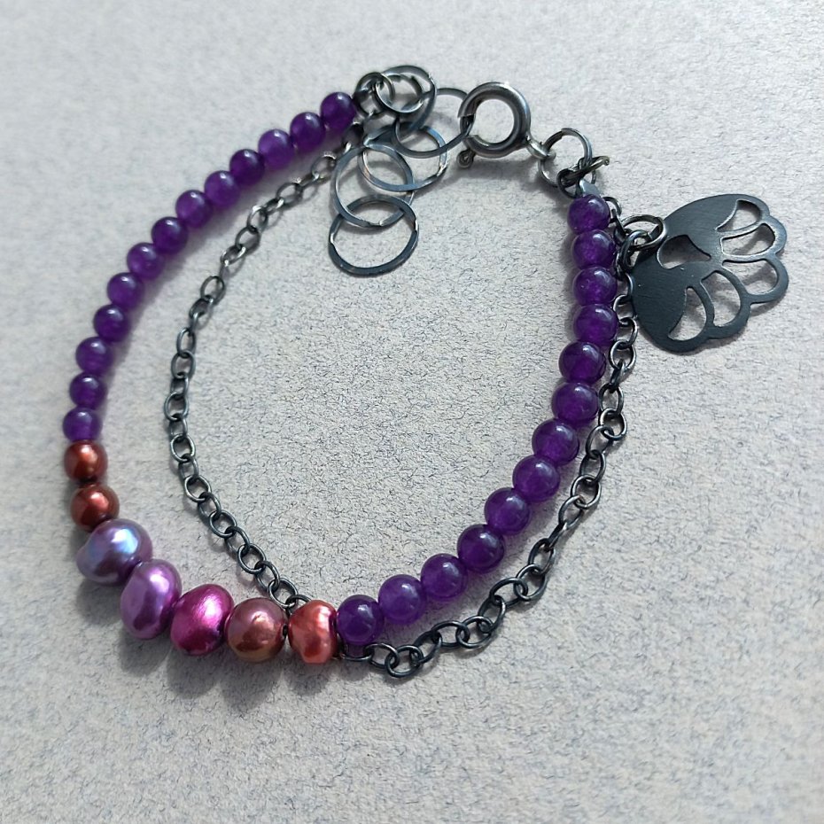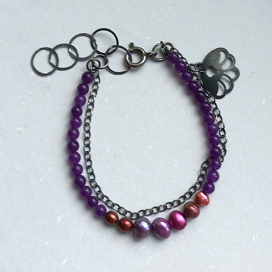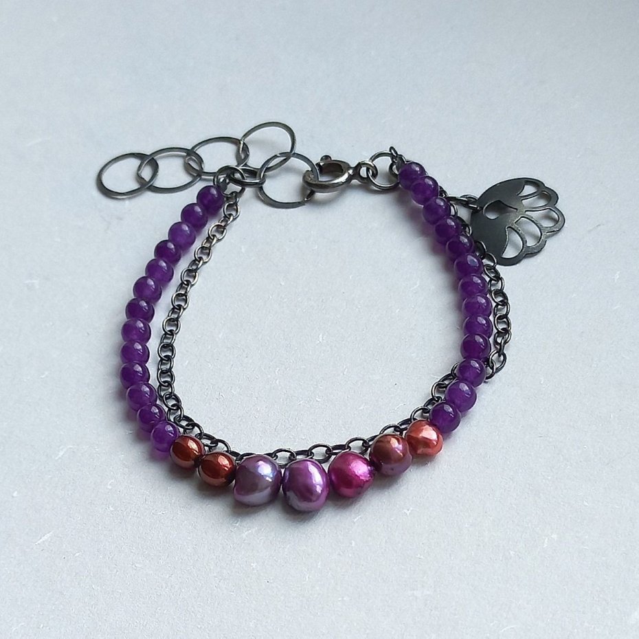 Bransoletka z 26 ametystów (3,5 mm), siedmiu nieregularnych perełek rzecznych oraz łańcuszka z przywieszką. Zapięcie: klasyczny feddering, duży i wygodny. Łańcuszek dystansowy ze sporych, płaskich ogniw stanowi dodatkową ozdobę. Wszystkie elementy metalowe - srebro 925, oksydowane.