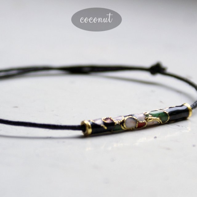 bransoletka z woskowanego sznurka, obwód regulowany - przesuwany supełek, ozdobny element metalowy, emaliowany, ok. 3 cm.