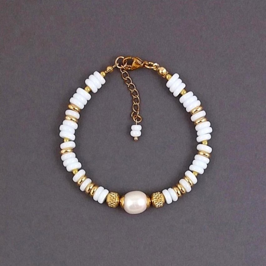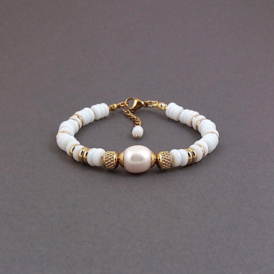 Bransoletka z krążków białego agatu i centralnie umieszczonej pięknej białej perły hodowlanej. Wszystkie elementy złote z nieuczulającej stali szlachetnej. Kamienie mają średnicę 6mm, a perła ma wymiary 9 x 12mm.
