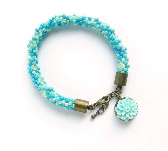 Bransoletka wykonana pracochłonną techniką sznurów szydełkowych z drobnych koralików w odcieniach zielonych i niebieskich z zawieszką kwiatkiem z żywicy. Długość bransoletki łącznie z łańcuszkiem 20 cm