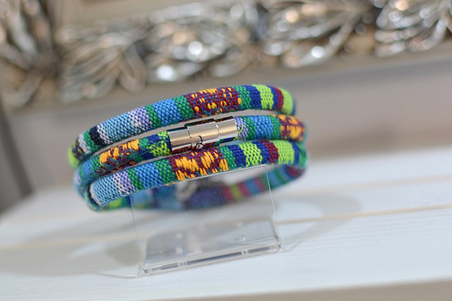 Barwna bransoletka w stylu BOHO wykonana z szytego, okrągłego rzemienia-liny z tkaniny (śr 6mm). Posiada magnetyczne zapięcie z blokadą ze stali szlachetnej. Ozdobę bransoletki stanowi cynowa zawieszka w kształcie kwiatu słonecznika o wymiarach ok.19x17 mm..