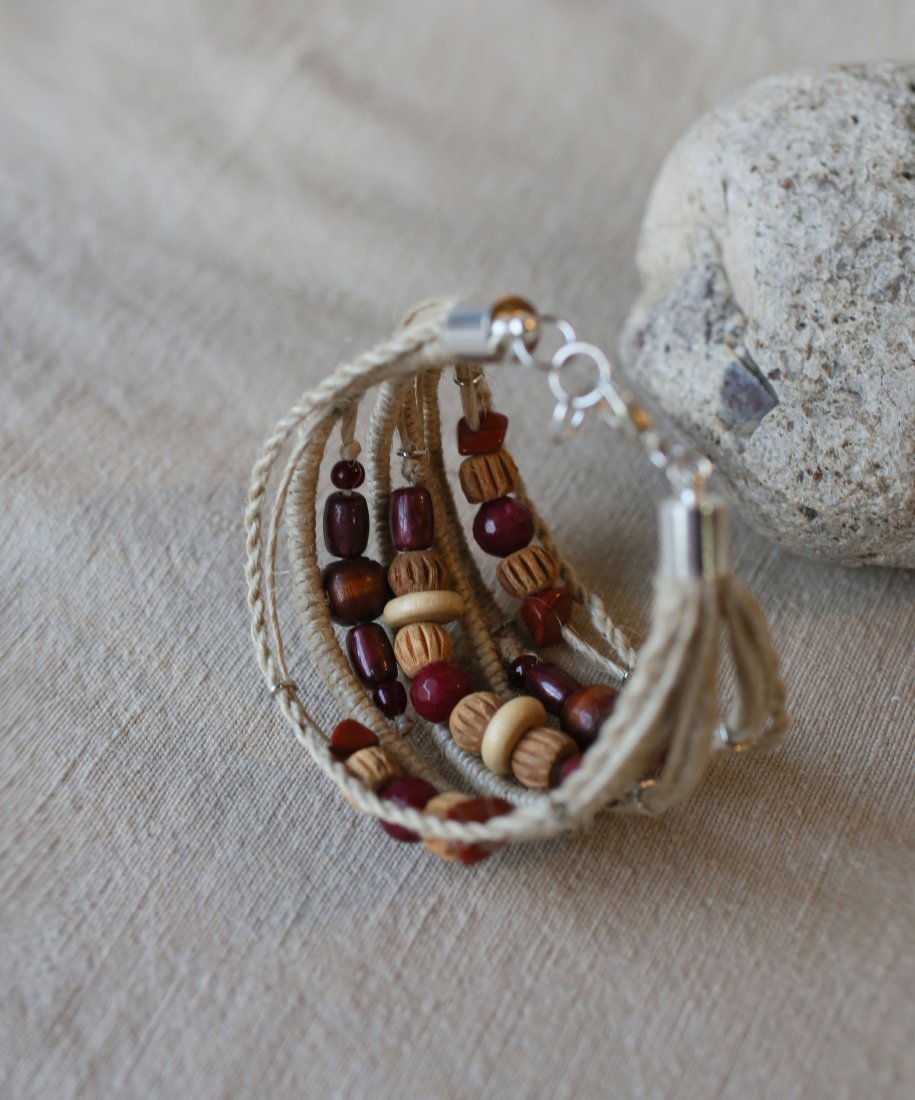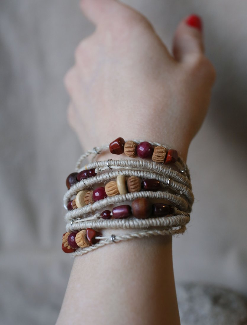 Bransoletka w stylu boho, wykonana ze sznurków lnianych i akrylowych oraz różnobarwnych koralików drewnianych, w kolorach ziemi. Zapięcie metalowe, w kolorze srebra. Pasuje na nadgarstek o obwodzie 15-16 cm.