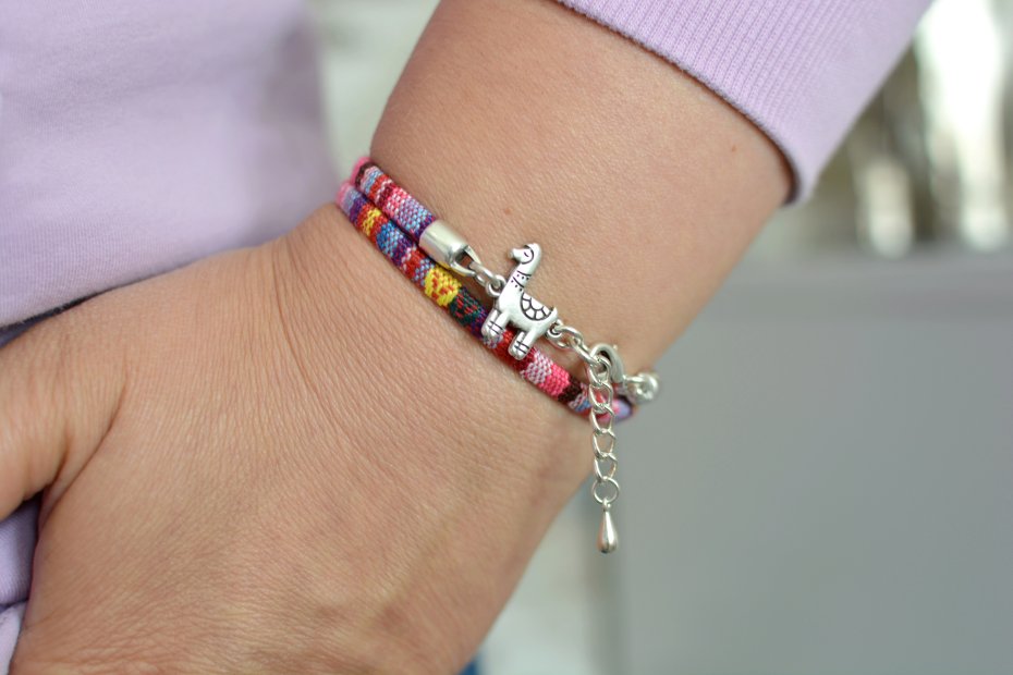 Podwójnie oplatająca nadgarstek bransoletka w stylu boho wykonana z szytego rzemienia ekologicznego (liny materiałowej o śr. 4mm), z materiału o wyraźnym splocie. Ozdobę bransoletki stanowi cynowy łącznik w kształcie lamy (15x17mm). Bransoletka zapinana jest na karabińczyk i posiada łańcuszek przedłużkowy ok. 2cm. Wszystkie elementy metalowe użyte w bransoletce są wykonane z posrebrzanej cyny (zostały wyprodukowane w UE).