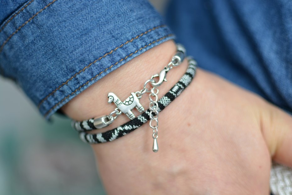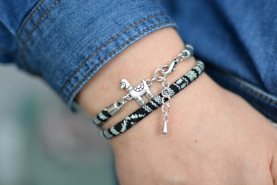 Podwójnie oplatająca nadgarstek bransoletka w stylu boho wykonana z szytego rzemienia ekologicznego (liny materiałowej o śr. 4mm), z materiału o wyraźnym splocie. Ozdobę bransoletki stanowi cynowy łącznik w kształcie lamy (15x17mm). Bransoletka zapinana jest na karabińczyk i posiada łańcuszek przedłużkowy ok. 2cm. Wszystkie elementy metalowe użyte w bransoletce są wykonane z posrebrzanej cyny (zostały wyprodukowane w UE).