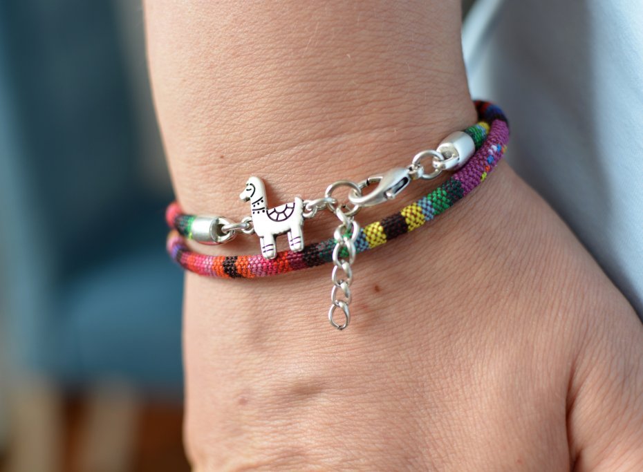 Podwójnie oplatająca nadgarstek bransoletka w stylu boho wykonana z szytego rzemienia ekologicznego (liny materiałowej o śr. 4mm), z materiału o wyraźnym splocie. Ozdobę bransoletki stanowi cynowy łącznik w kształcie lamy (15x17mm). Bransoletka zapinana jest na karabińczyk i posiada łańcuszek przedłużkowy ok. 2cm. Wszystkie elementy metalowe użyte w bransoletce są wykonane z posrebrzanej cyny (zostały wyprodukowane w UE).