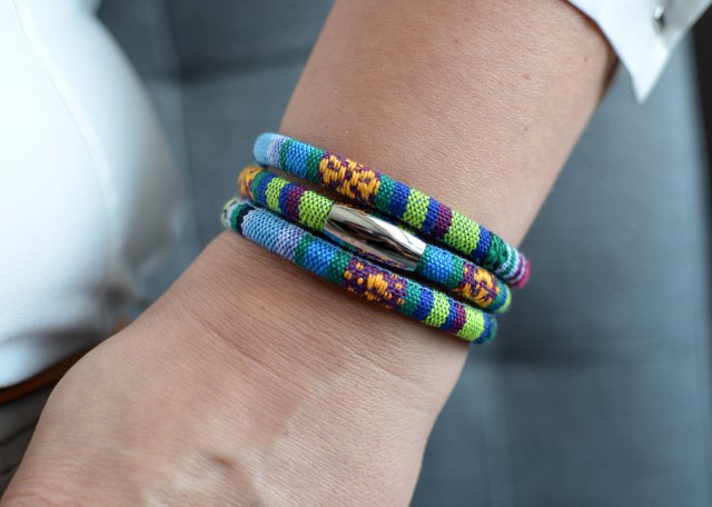 Barwna bransoletka w stylu BOHO wykonana z szytego okrągłego rzemienia-liny z tkaniny (śr. 6mm). Bransoletka o mocnym, magnetycznym zapięciu ze stali szlachetnej, które jest równocześnie jej prostą ozdobą.