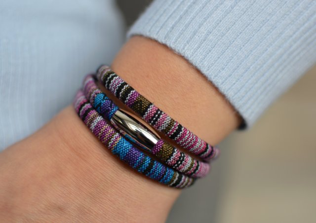 Barwna bransoletka w stylu BOHO wykonana z szytego okrągłego rzemienia-liny z tkaniny (śr. 6mm). Bransoletka o mocnym, magnetycznym zapięciu ze stali szlachetnej, które jest równocześnie jej prostą ozdobą.
