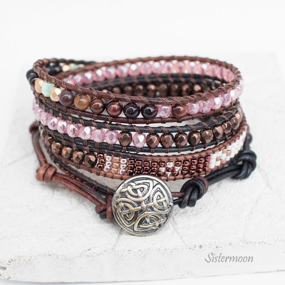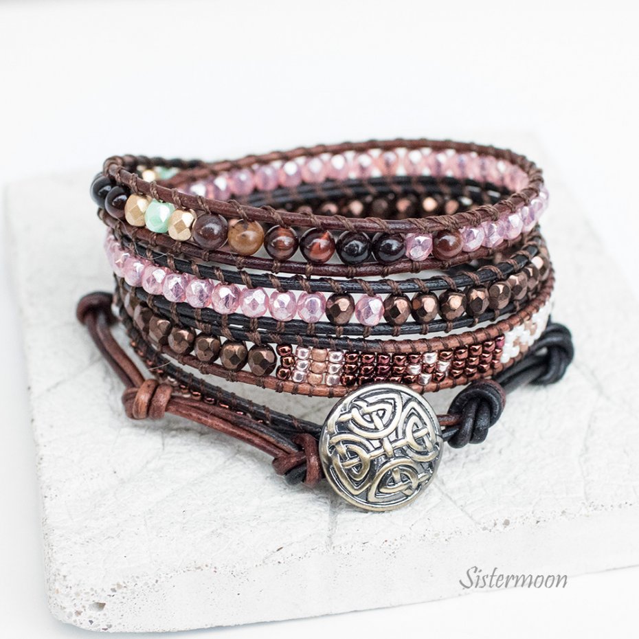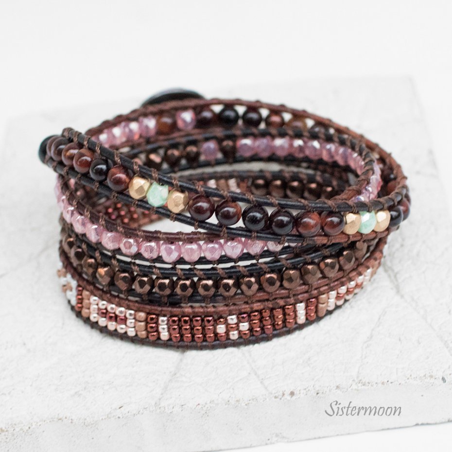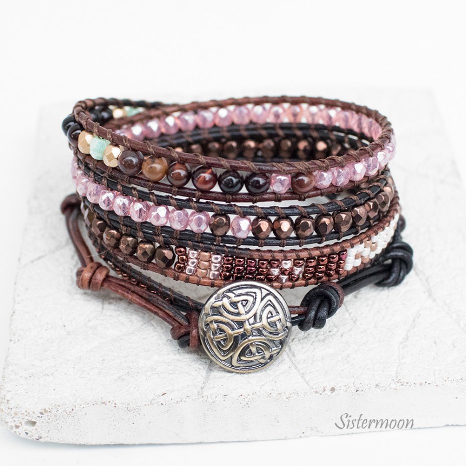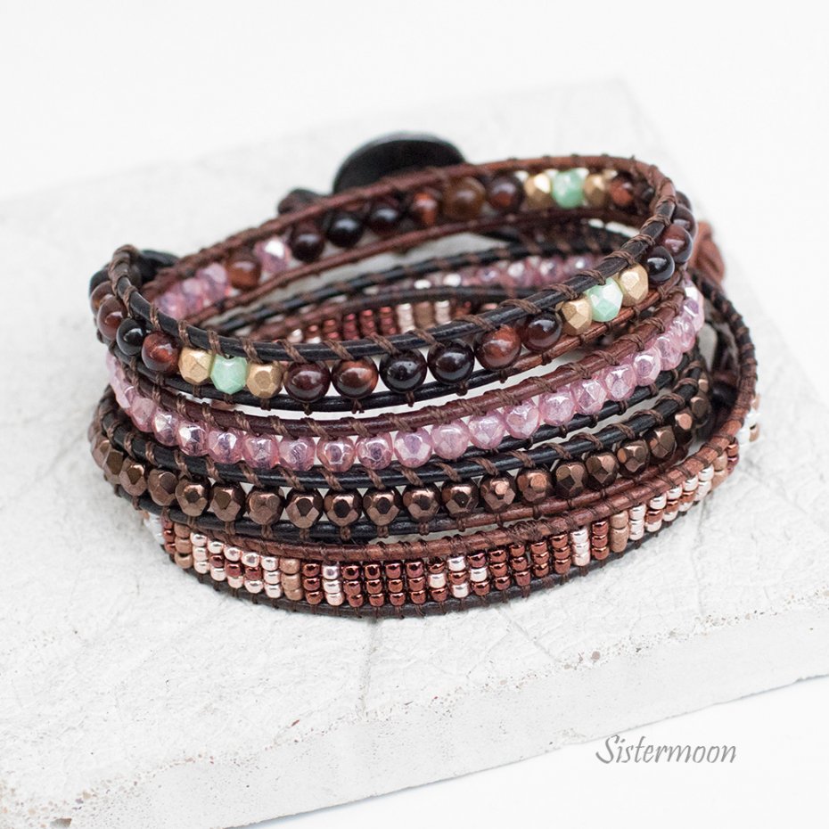Bransoletka owijana wokół nadgarstka, bransoleta w stylu Chan Luu, wykonana na bazie skórzanego lakierowanego rzemienia w kolorze przecieranego brązu (vintage efekt). Szklane czeskie kryształki Fire Polish, japońskie koraliki Toho z nieścieralną powłoką, minerały – gładkie kulki bawole oko w średnicy 4 mm, zapinanie na oryginalny metalowy guzik. Do owinięcia 4x wokół nadgarstka. Nadmiarowe końce rzemyka odciąć po dopasowaniu do nadgarstka.