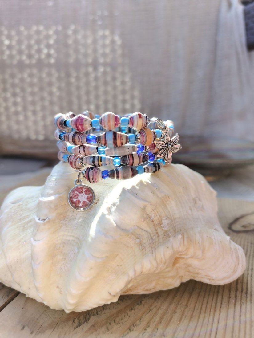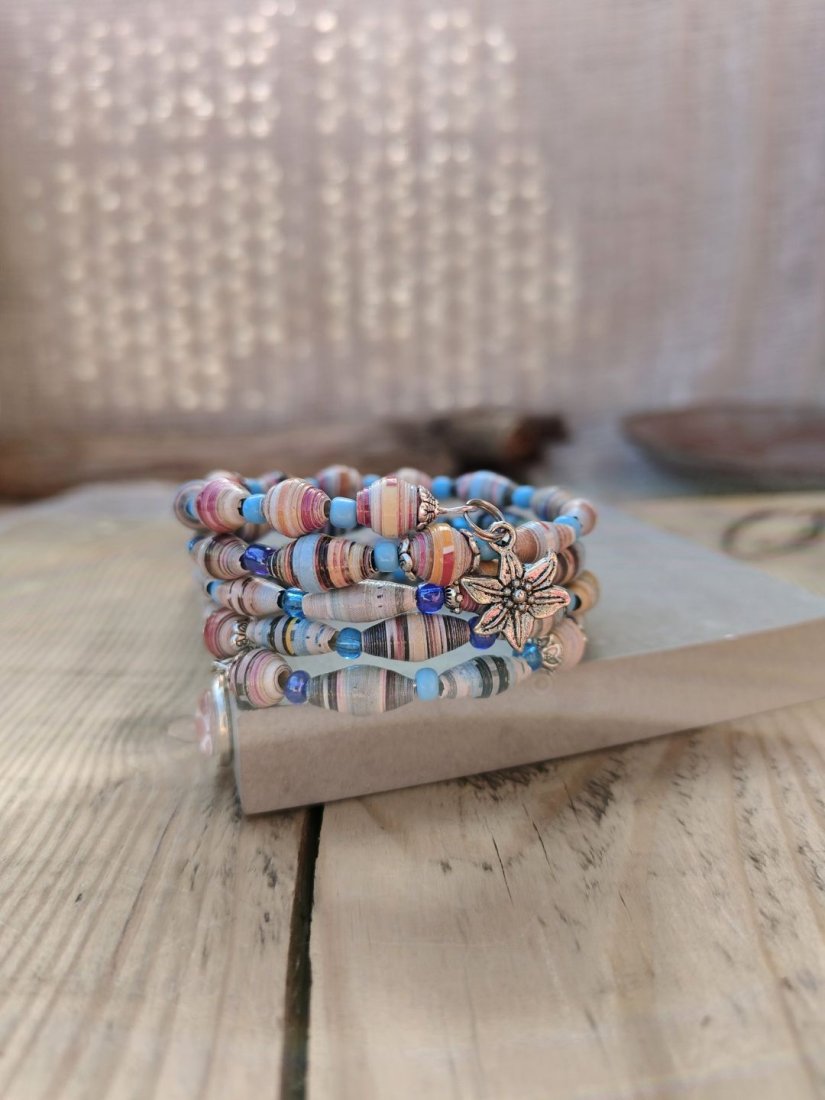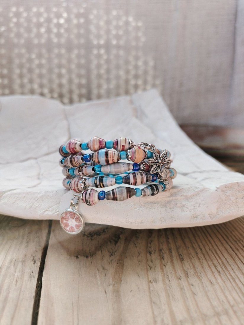 Ręcznie wykonana bransoletka w stylu boho, stworzona z unikalnych koralików z papieru, zachwyca lekkością i artystycznym charakterem. Każdy koralik ma niepowtarzalny wzór, co sprawia, że każda sztuka jest jedyna w swoim rodzaju. Subtelne odcienie turkusu, beżu i różu przywołują skojarzenia z morską bryzą i letnim relaksem. Elastyczna forma sprawia, że bransoletka pięknie układa się na nadgarstku, a delikatna zawieszka dodaje jej wyjątkowego uroku.