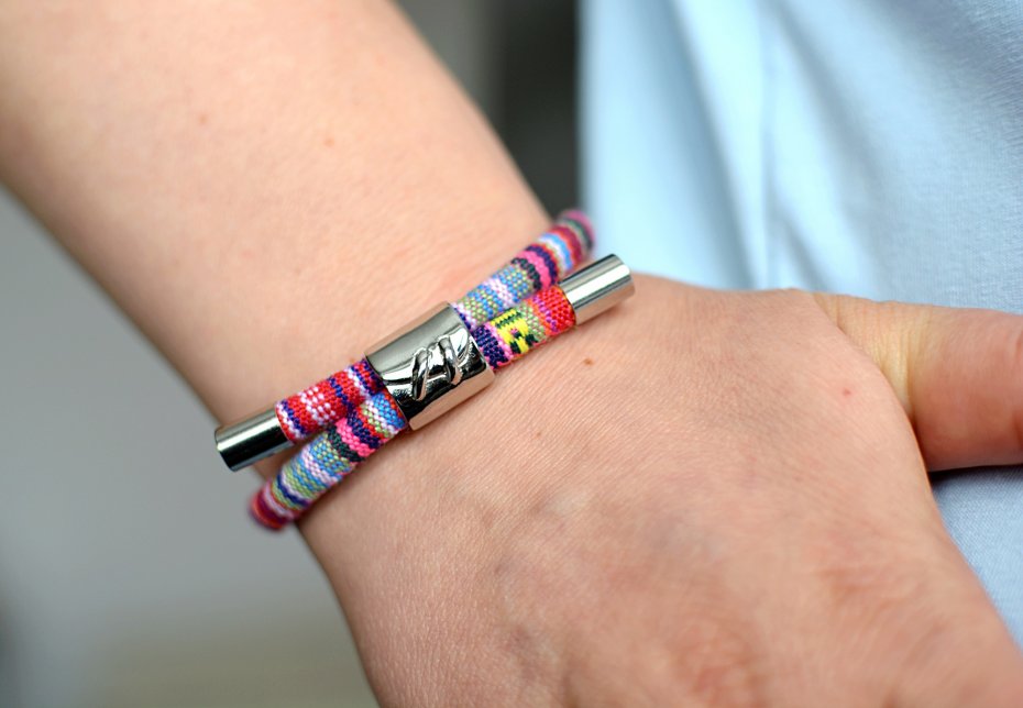 Damska bransoletka w stylu BOHO wykonana z szytego, okrągłego rzemienia-liny (śr. 6mm) z tkaniny o wyraźnym splocie. Ozdobę stanowi przekładka, która jest elementem regulacyjnym długości bransoletki. Wszystkie elementy metalowe użyte do wykonania tej bransoletki są ze stali szlachetnej zwanej także stalą chirurgiczną.