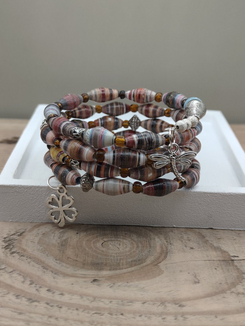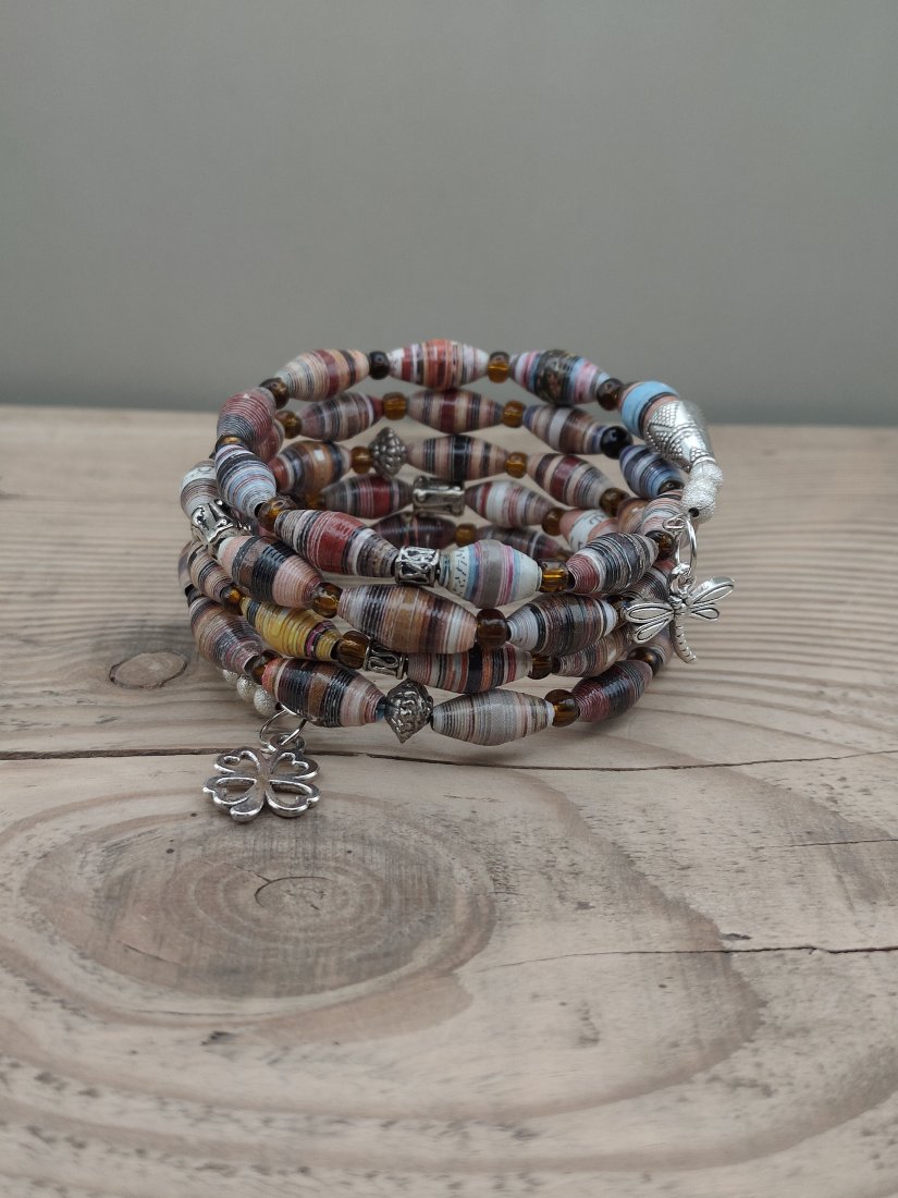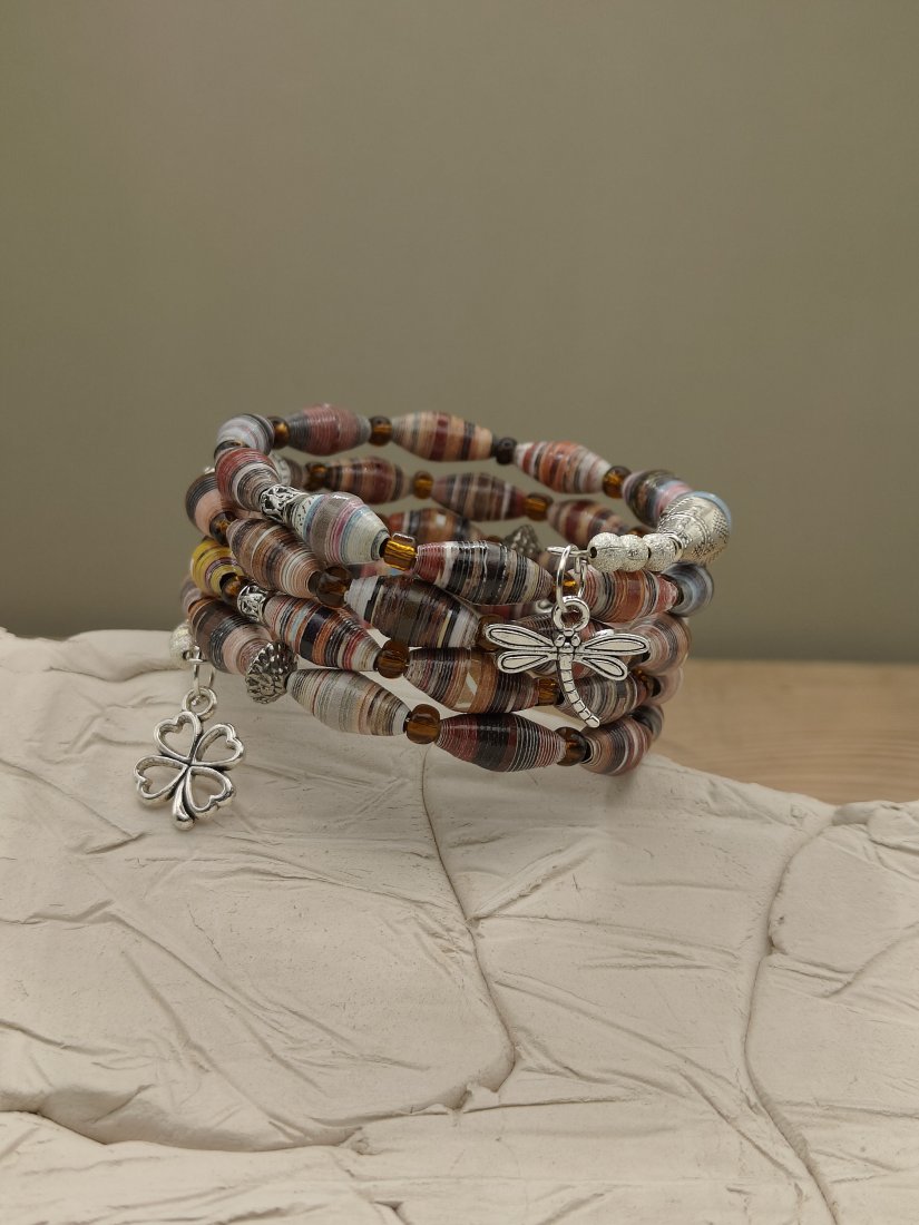 Wyjątkowa bransoletka w stylu boho, wykonana z ręcznie zwijanych papierowych koralików o subtelnych, wielobarwnych odcieniach. Naturalna paleta barw – beże, bordo, błękity i ciepłe brązy – tworzy harmonijną całość, która idealnie dopełni zarówno codzienne, jak i bardziej artystyczne stylizacje.