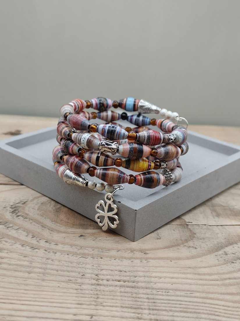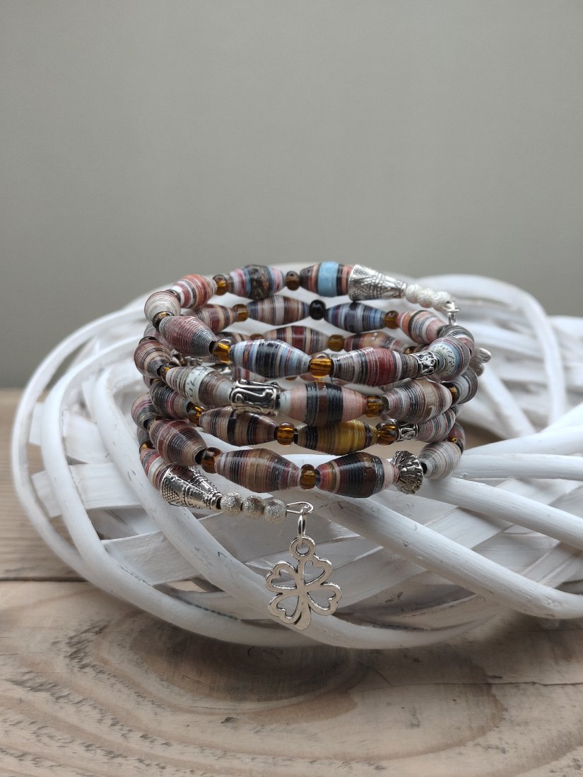 Bransoletka wielokrotnie owija się wokół nadgarstka, tworząc efekt bogatej kompozycji. Całość uzupełniają ozdobne elementy w kolorze srebra oraz delikatna zawieszka w kształcie czterolistnej koniczyny – symbolu szczęścia i dobrej energii. To biżuteria z duszą, dla osób ceniących rękodzieło i unikalność.