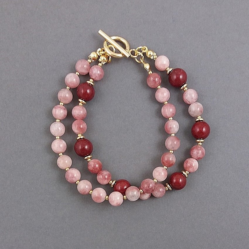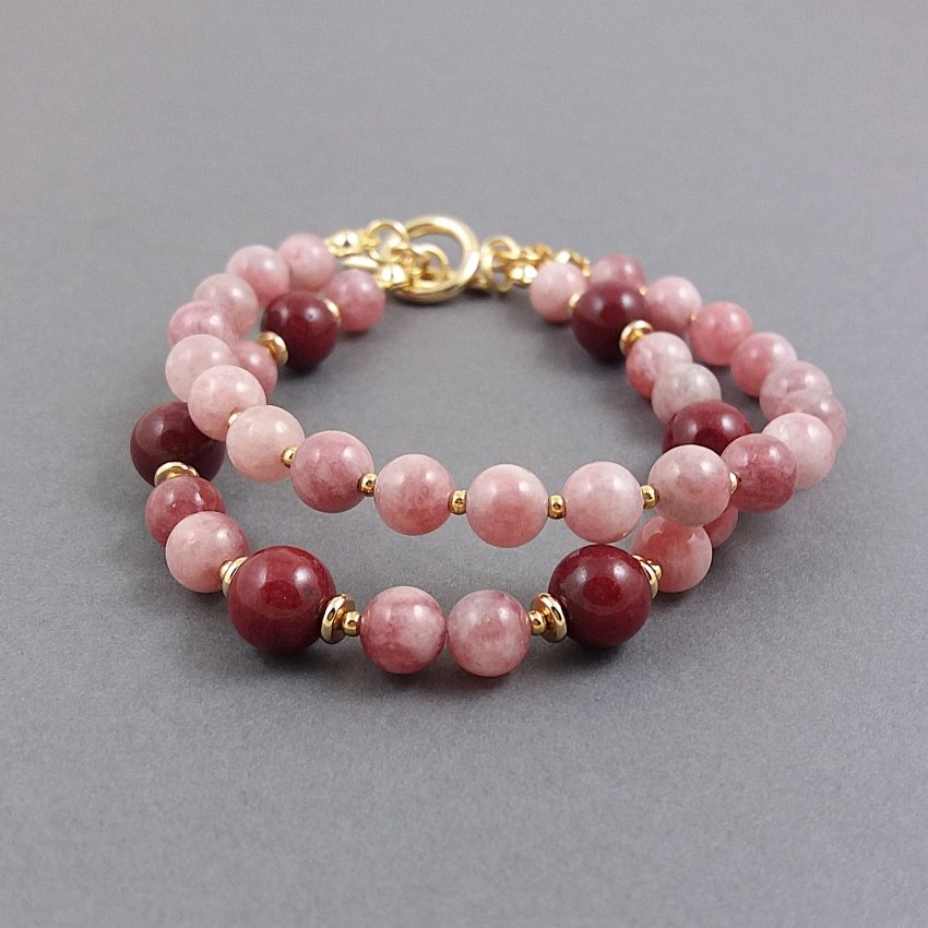 Podwójna bransoletka naturalnych kamieni, bordowych kulek jadeitu i kulek kamienia słonecznego w niejednorodnym kolorze chłodnego, zgaszonego różu. Kamienie mają średnicę 6 i 8mm.