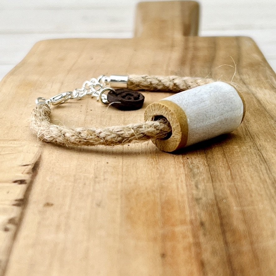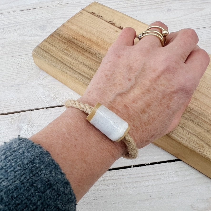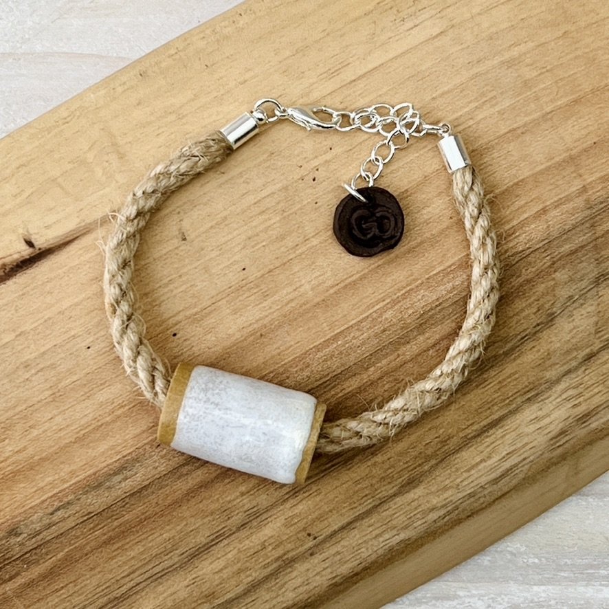 Ręcznie wykonana bransoleta w postaci liny jutowej i sporego, ceramicznego koralika w kształcie tuby. Tuba ma kolor perliście biały z połyskującymi gwiazdkami kryształków. Bransoletka stworzy harmonijną kompozycję z naturalnymi materiałami jak len, wełna, bawełna. Będzie wyjątkowym prezentem dla osoby lubiącej produkty naturalne, ręcznie wykonane, również dla mężczyzny.