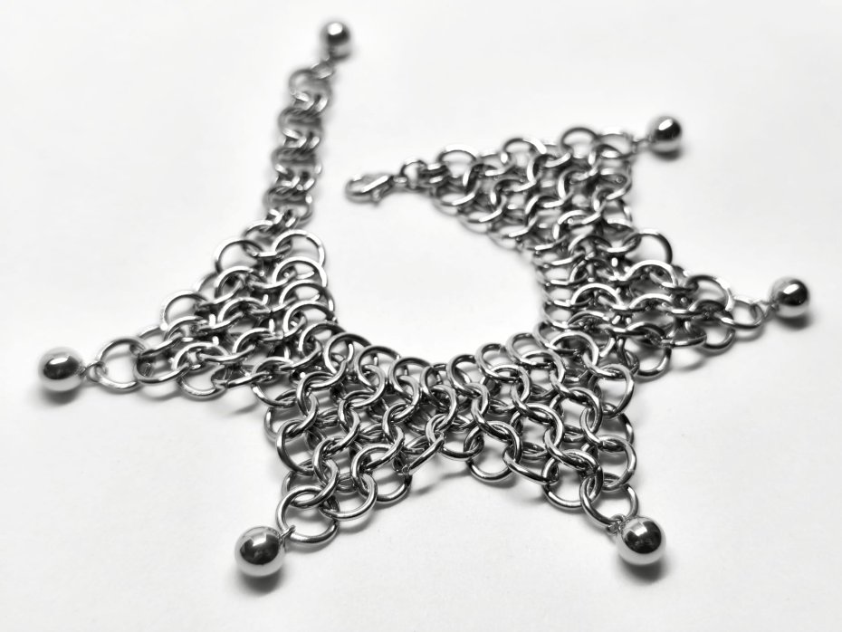 Szeroka, ciężka bransoletka ręcznie pleciona techniką chainmaille ze stali chirurgicznej 316L – gęsta warstwowa plecionka z wiszącymi kuleczkami ze stali nierdzewnej. Wodoodporna, hipoalergiczna, nie rdzewieje, nie ciemnieje – możesz nosić non-stop, pod prysznic, na trening czy imprezę.