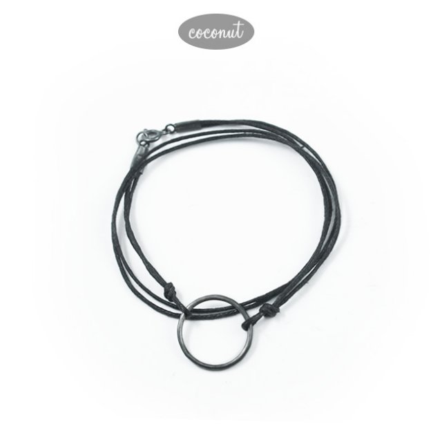 Bransoletka na woskowanym bawełnianym sznurku, obwód ok. 17,3 (podwójnie owija się wokół nadgarstka), elementy ze srebra, oksydowane, koło ok. 2 cm.