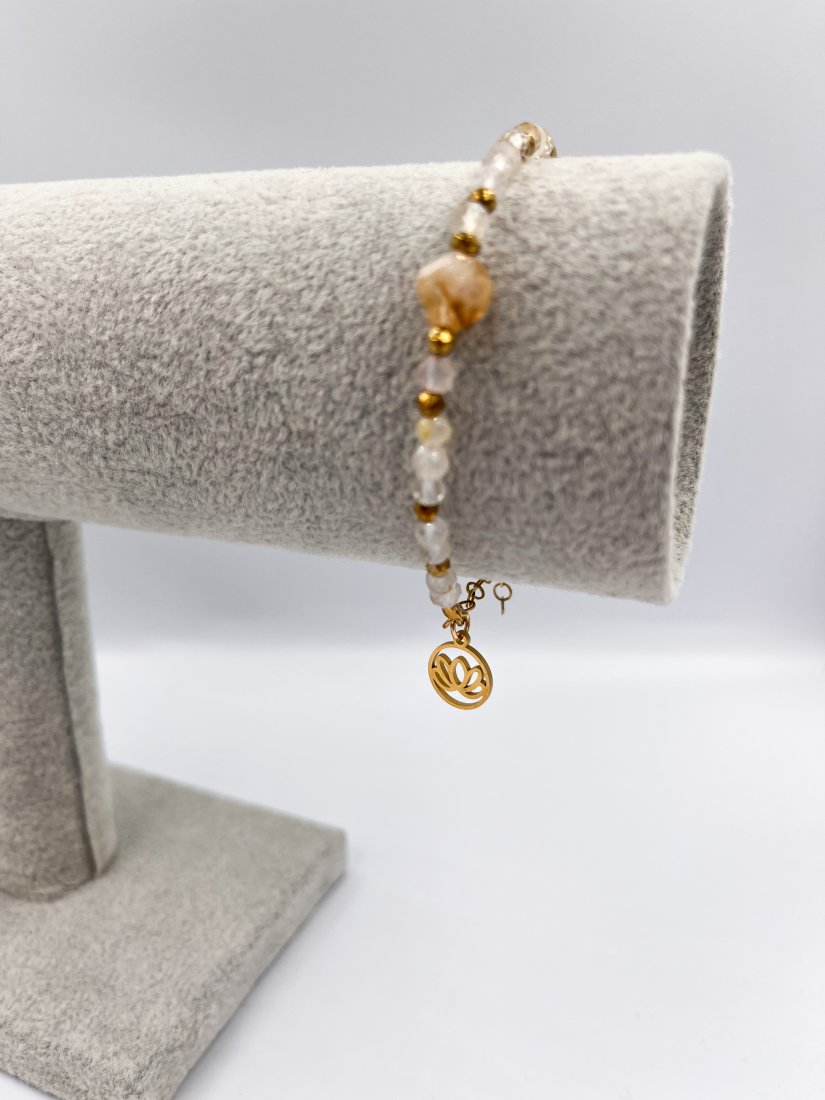 Bransoletka przepleciona jest hematytem w złotym kolorze. Zawieszka w złotym kolorze ze stali szlachetnej z motywem kwiatu lotosu.