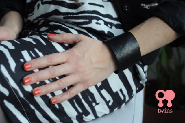 .Efektowna bransoleta wykonana w całości ze skóry naturalnej w kolorze czarnym. Ręcznie wycinana. Obwód wewnętrzny po zapięciu: 19 cm. Zapina na zatrzaski. Projekt autorski TWINS.