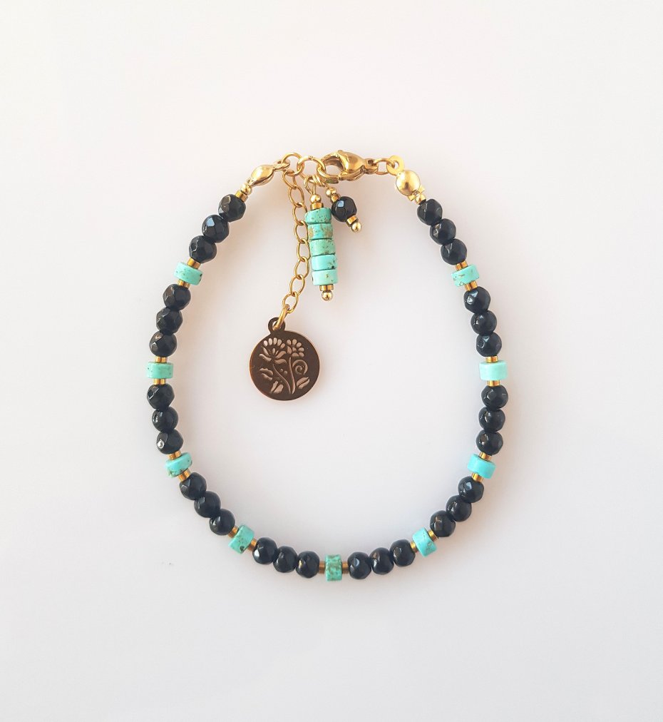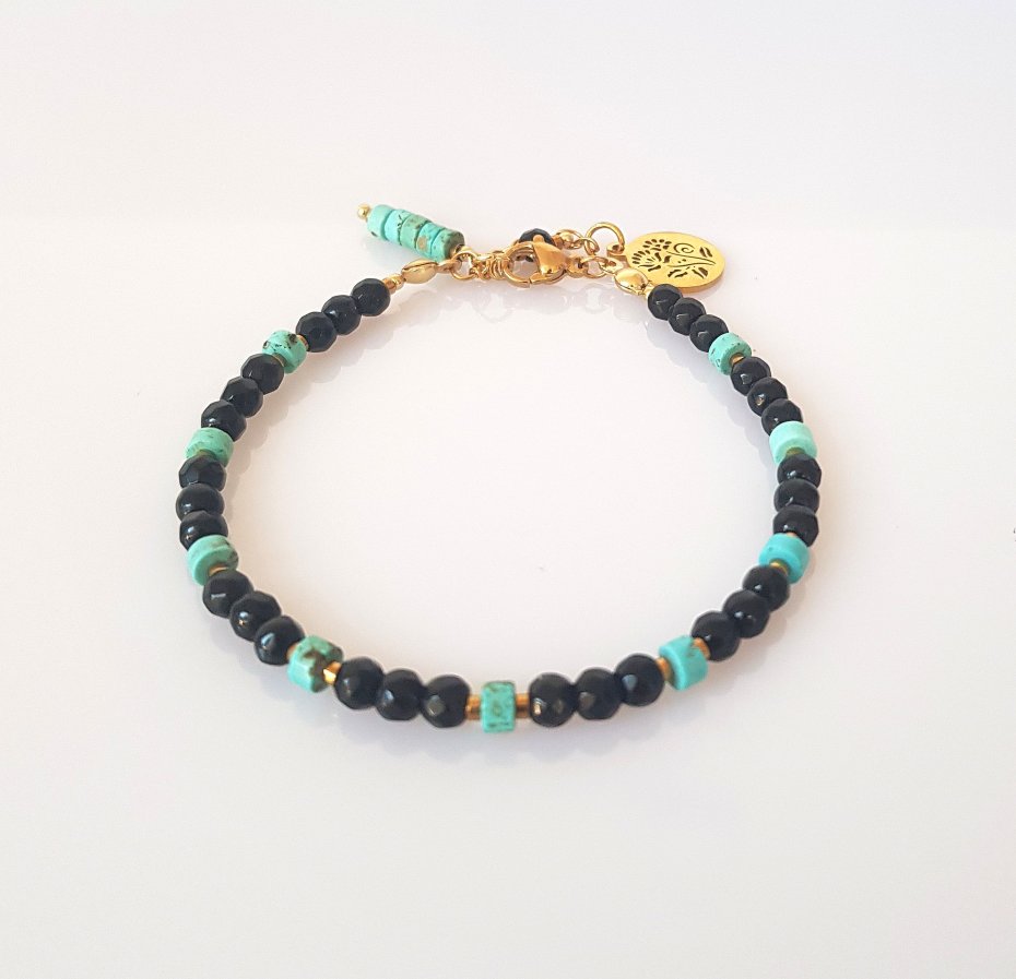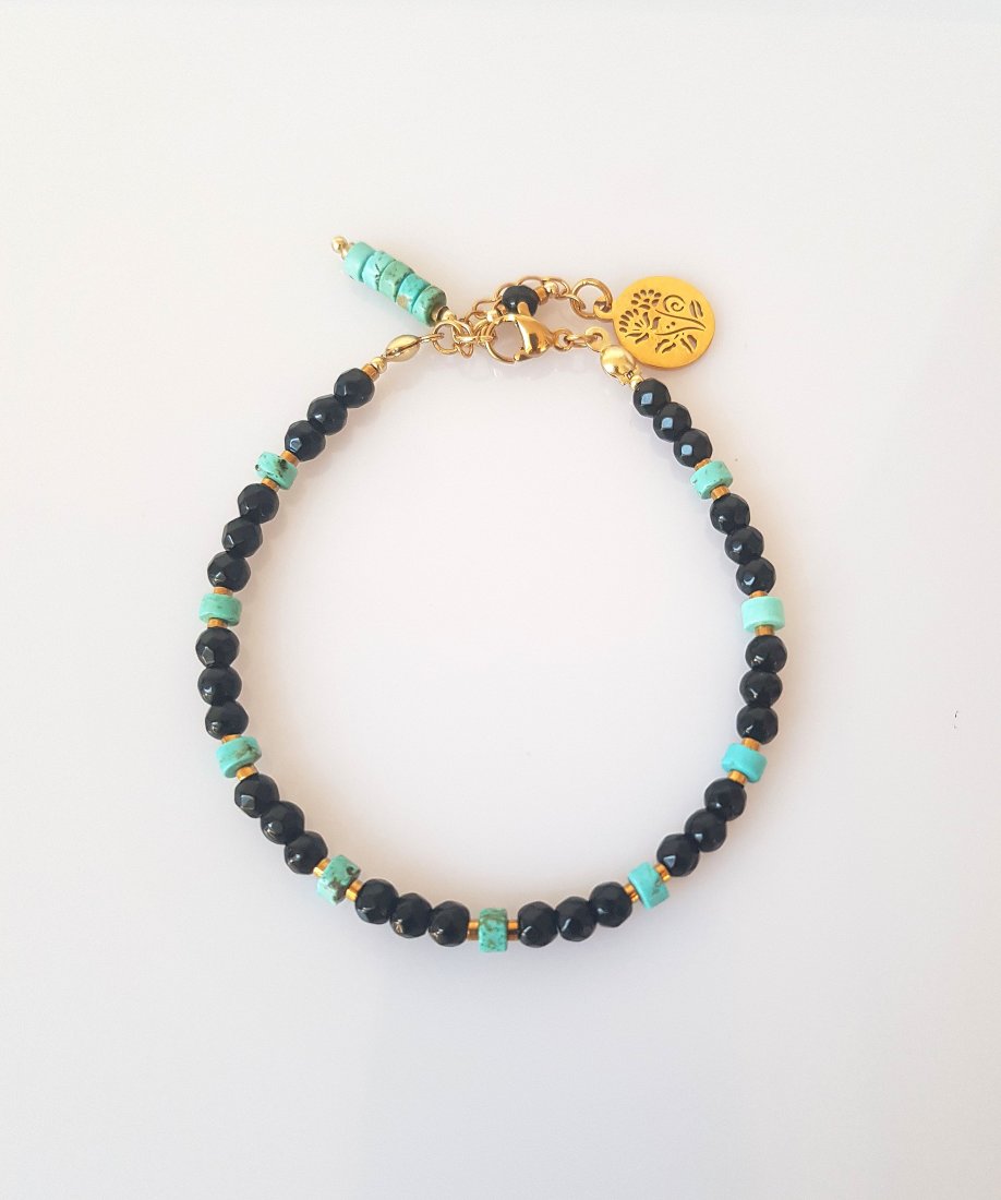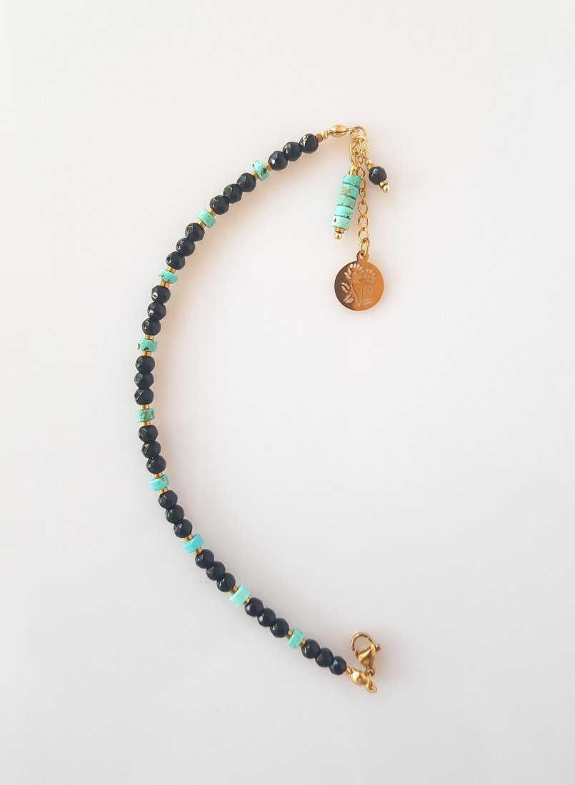 Wykonana z fasetowanych kulek czarnego jadeitu i plasterków turkusowego howlitu.