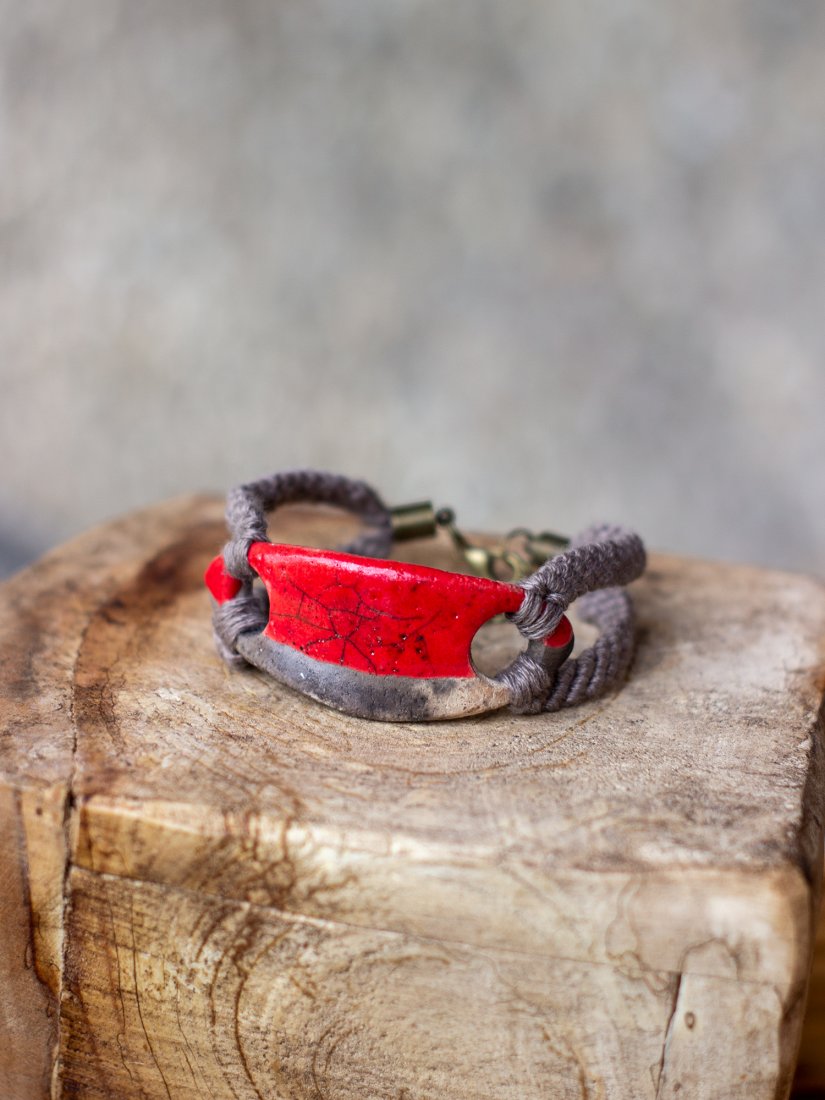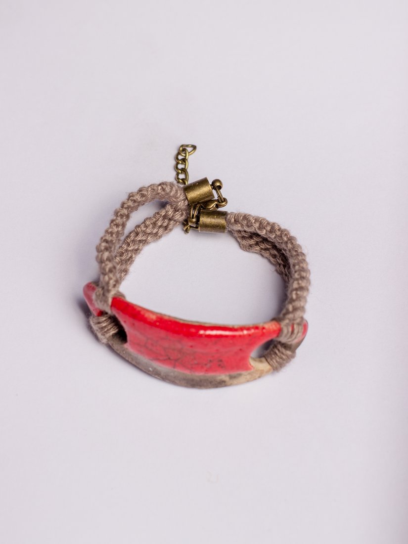 Ciekawa bransoletka wykonana z ceramicznego elementu wypalonego techniką raku z jasnej gliny pokrytej czerwonym szkliwem. Wykończona bawełnianym kordonkiem w kolorze umbry zaplecionym techniką makramy. Zapięcia zrobione z mosiądzu z przedłużką.