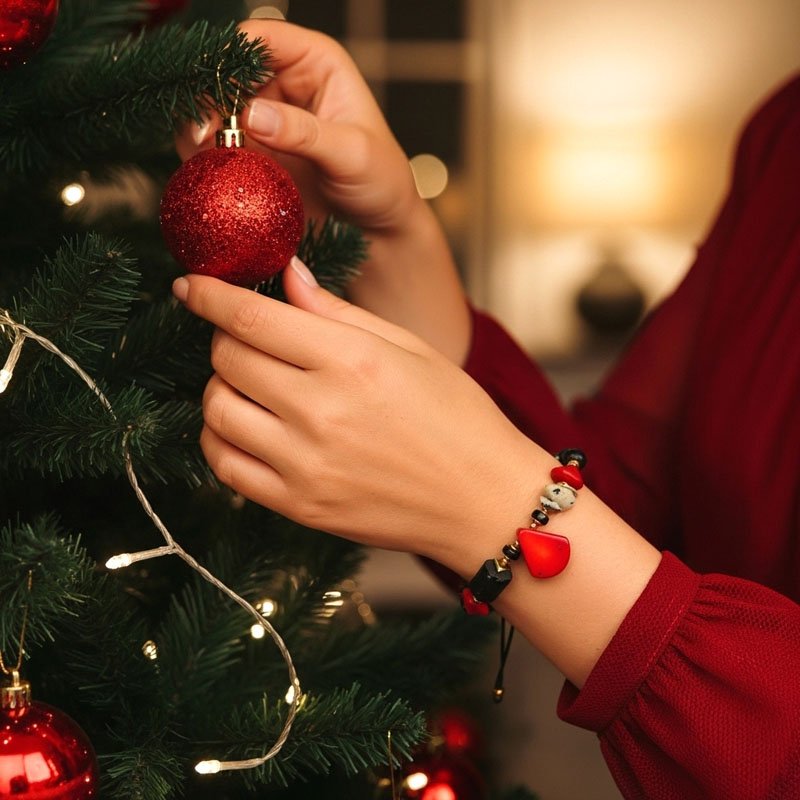 Ta świąteczna bransoletka handmade została stworzona z myślą o wyjątkowych chwilach — tych, które celebrujesz w blasku lampek choinkowych, przy zapachu korzennych przypraw i dźwięku cichej rozmowy z najbliższymi. Inspirowana podróżami po egzotycznych zakątkach świata, łączy w sobie siłę żywiołów: ognisty czerwony koral, głęboki jak noc czarny onyks, surowy turmalin, mistyczny jaspis dalmatyński i elegancki połysk złotego hematytu.