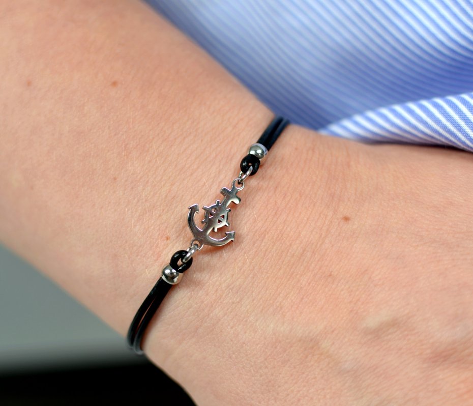 Delikatna, damska bransoletka na bazie czarnych rzemyków skórzanych, z łącznikiem ze stali szlachetnej w kształcie kotwicy (18x12mm).