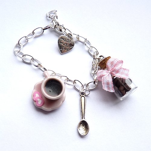 Oryginalna i słodka bransoletka z filiżanką kawy, łyżeczką oraz miniaturowym słoiczkiem pełnym ziarenek kawy:) długość bransoletki regulowana, średnica talerzyka: 1,7cm wysokość filiżanki: 0,8cm długość łyżeczki: 2cm wysokość słoiczka wraz z korkiem: ok.2cm. Wysyłam ozdobnie zapakowaną;)