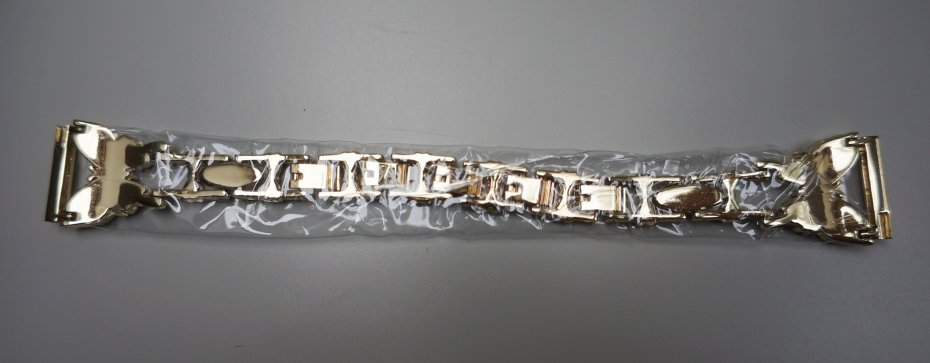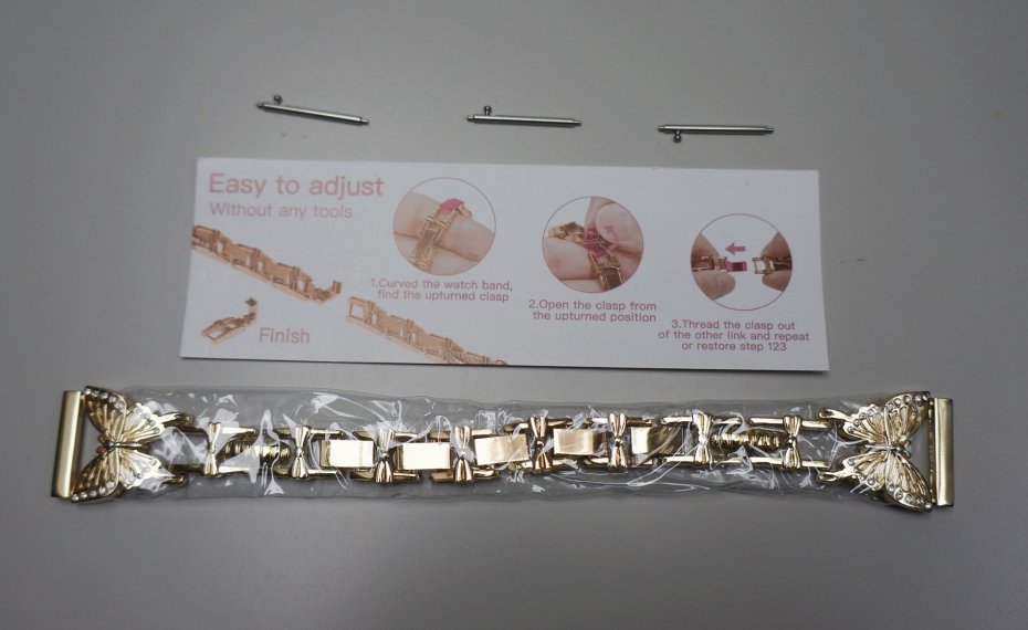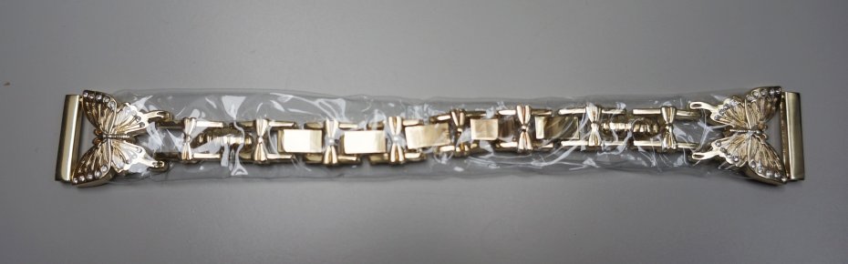 Metalowa bransoletka do zegarka, w kolorze złotym. Posiada ozdobne elementy w kształcie motyli i pszczół. Szerokość paska 2 cm. Długość bransoletki 16 cm. Stan nowy, nieużywany.