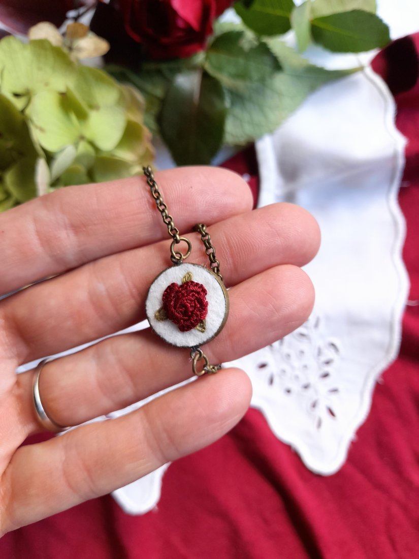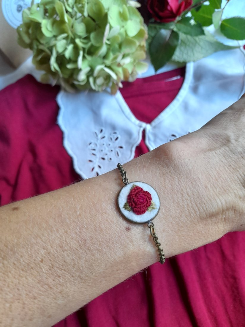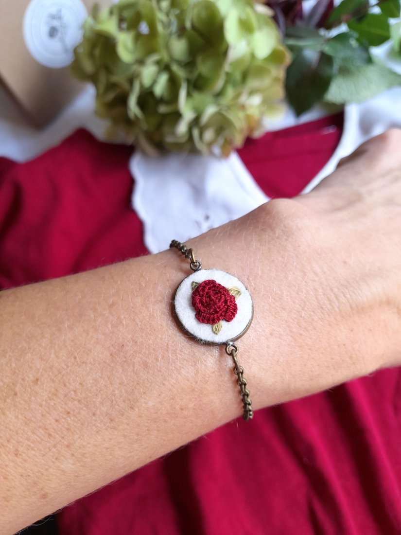 Bordowa, ręcznie haftowana z dbałością róża w oprawie w kolorze starego złota będzie piękną ozdobą nadgarstka. Doda klimatu retro codziennej, prostej stylizacji lub dopełni uroku delikatnej sukienki. Ucieszy kobiety lubiące romantyczny styl.