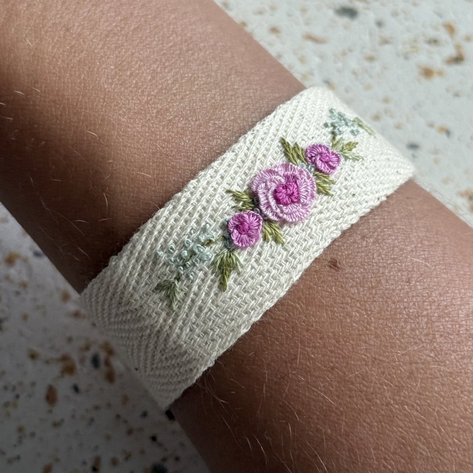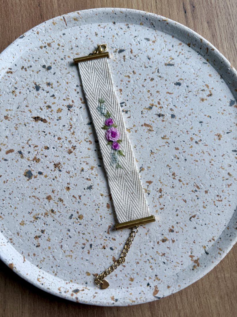 Bransoletka haftowana ręcznie – róże na bawełnianej taśmie