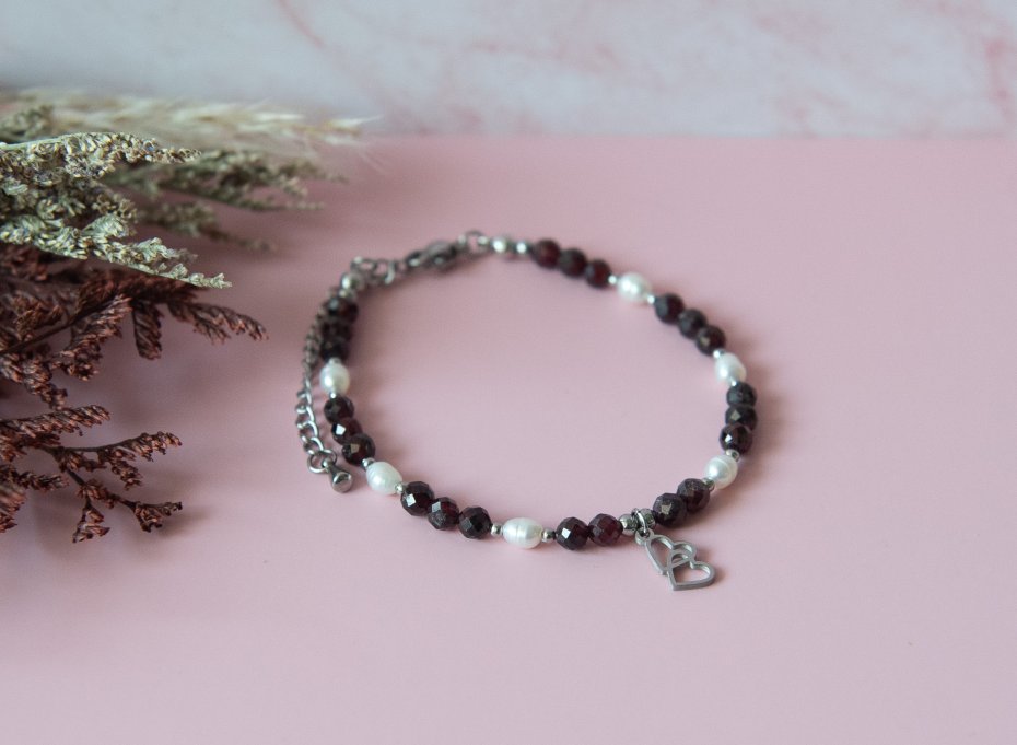 Tagi: #bransoletka z kamieni, #granat, #perła słodkowodna, #serce walentynki