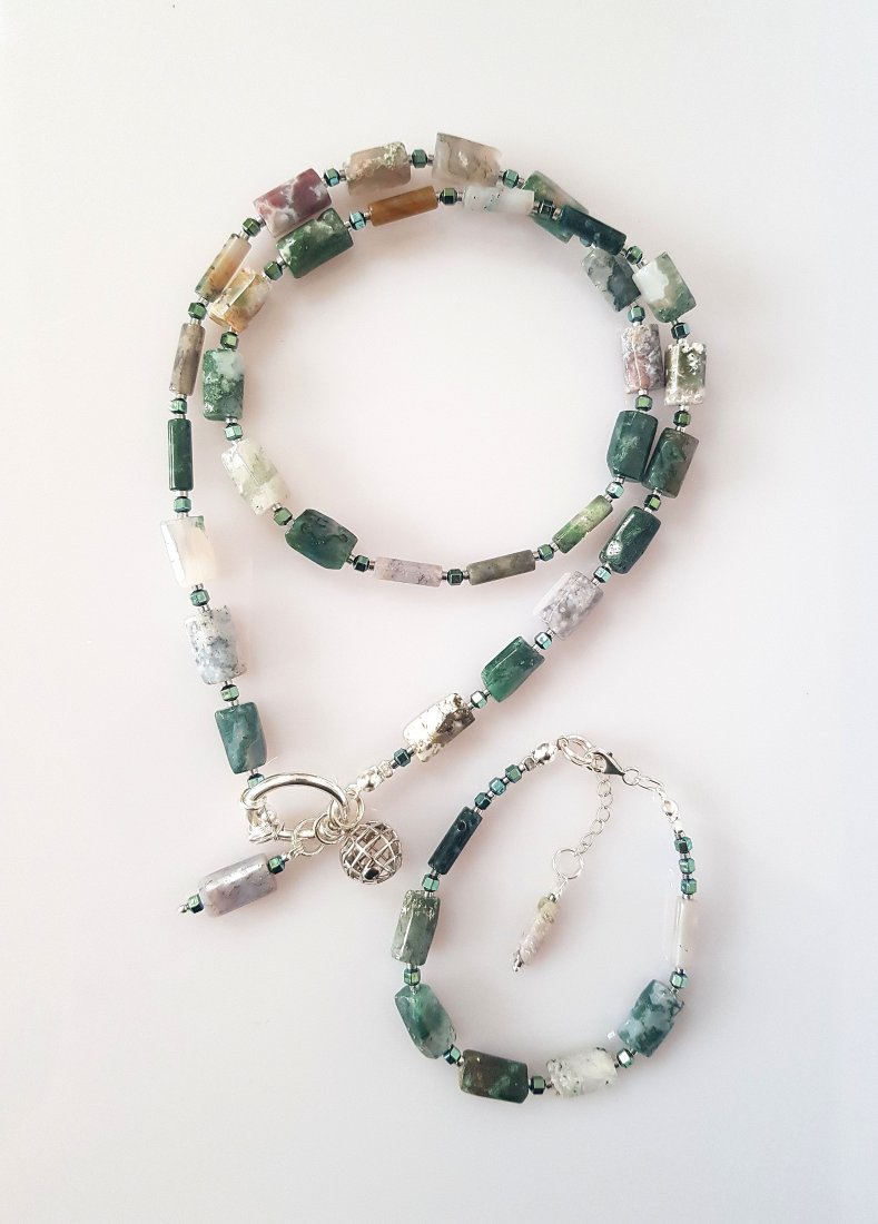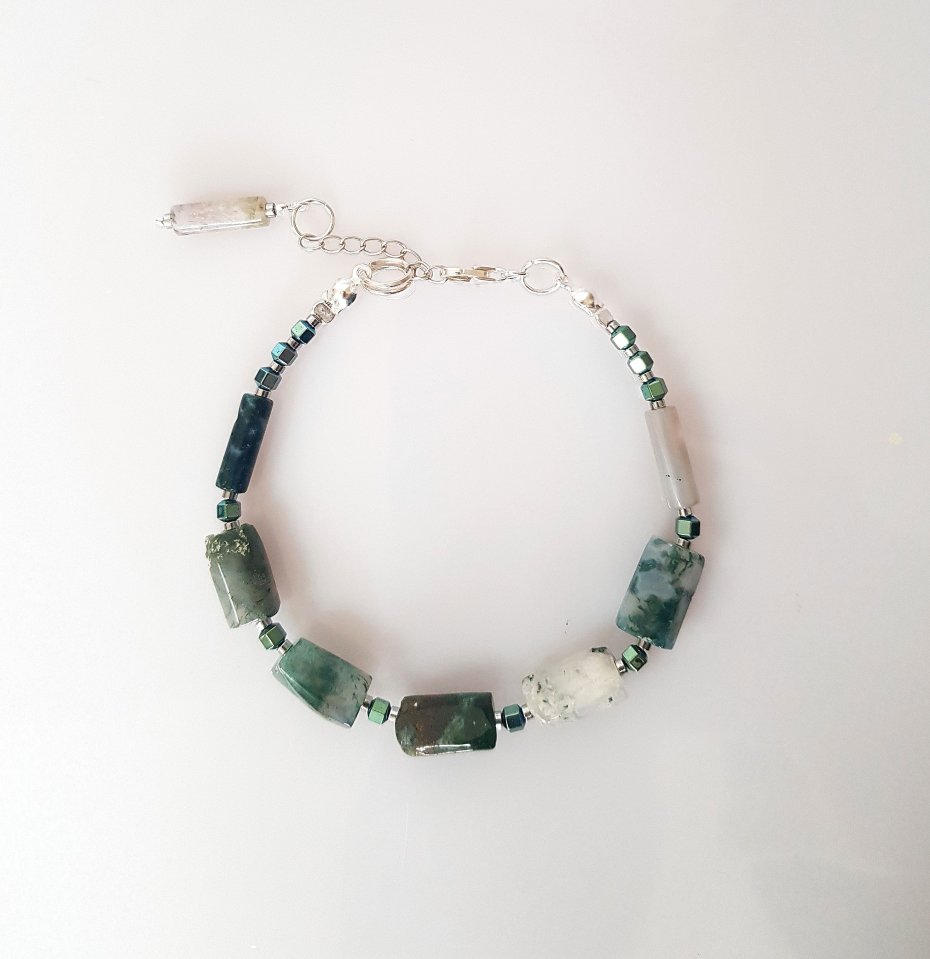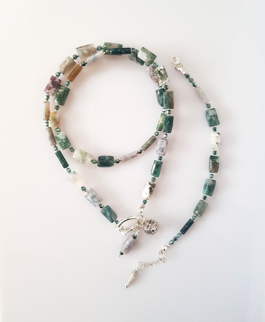 Agat indyjski w zachwycających kolorach w formie ciosanych, szlifowanych walców oraz patyczków i dodający industrialnego charakteru jasno zielony błyszczący hematyt.