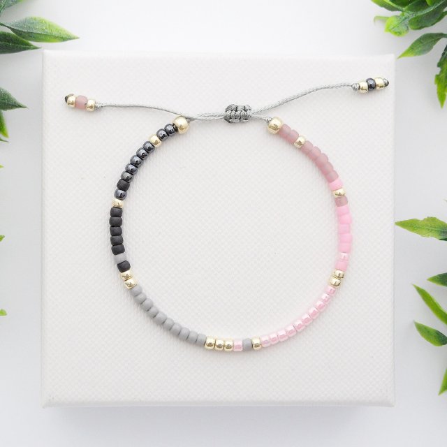 Delikatna damska bransoletka koralikowa Minimal - Grey and Pink to połączenie różnych odcieni modnych kolorów. Całość dopełniają srebrne koraliki tworząc delikatny i kobiecy efekt, który będzie pasował do wielu stylizacji.