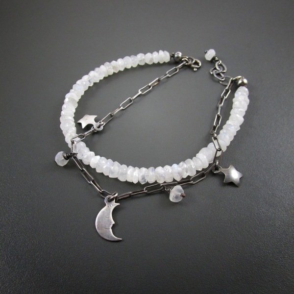 Bransoletka wykonana ze sznura oponek kamienia księżycowego 5 mm oraz łańcuszka z zawieszonymi oponkami kamienia księżycowego, blaszki księżyc 14,5/8 mm oraz dwóch wypukłych blaszek gwiazdek 13/9 mm. Całość wykończona srebrem 925, oksydowanym i wypolerowanym. Długość bransoletki wynosi 19cm plus łańcuszek regulacyjny 2 cm. Pasuje na nadgarstek 16-17 cm. Elegancko zapakowana.